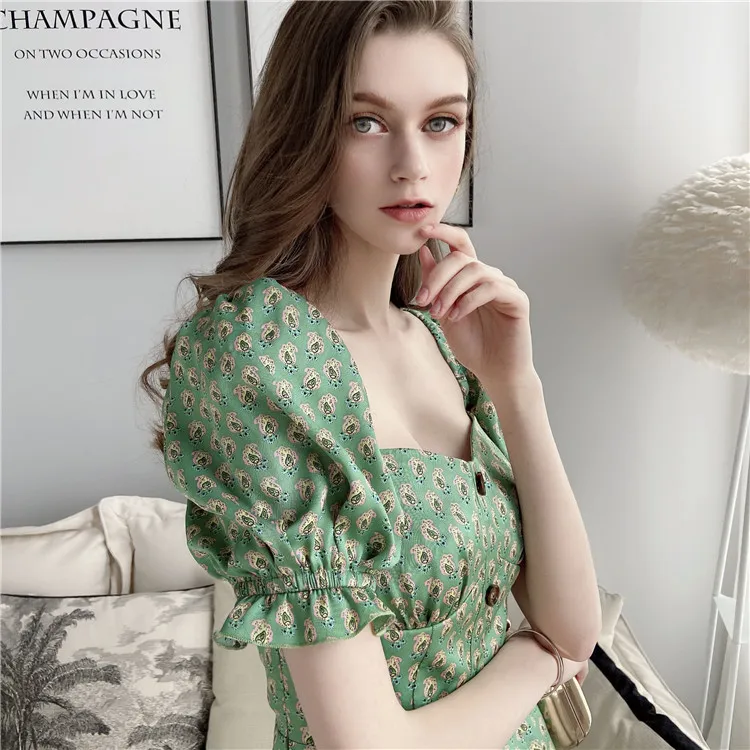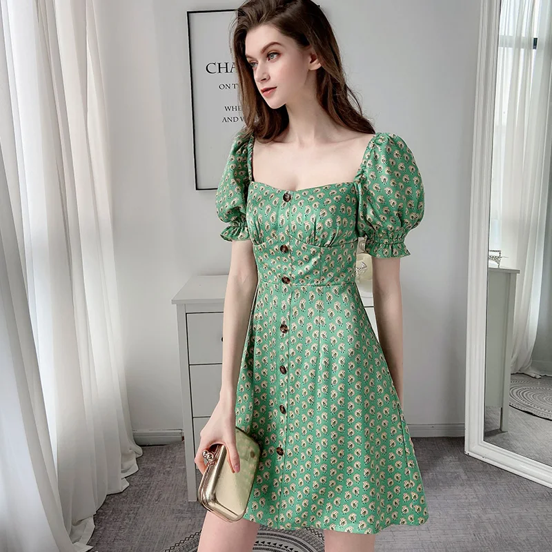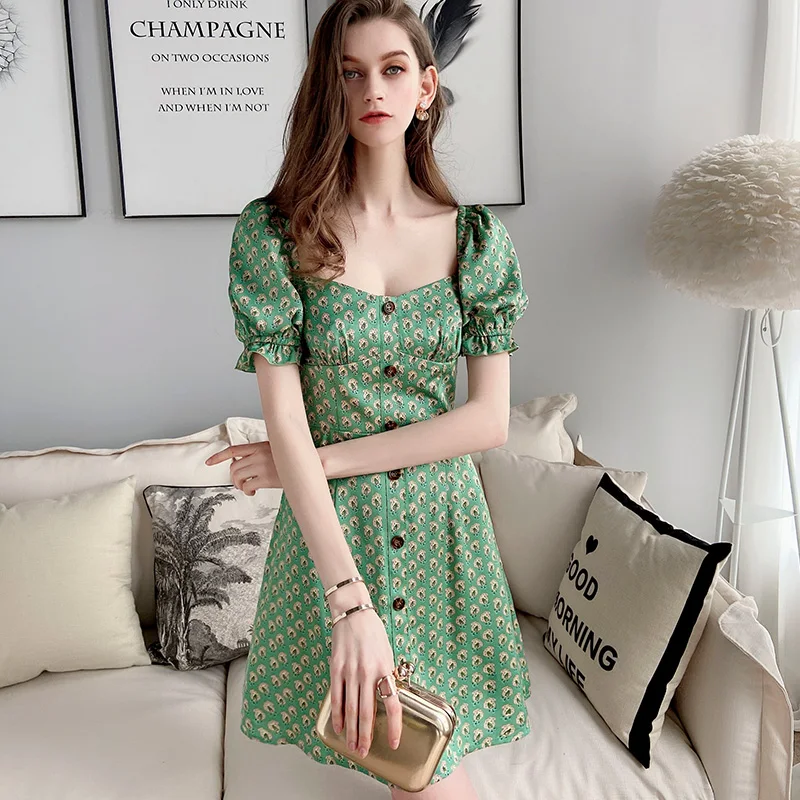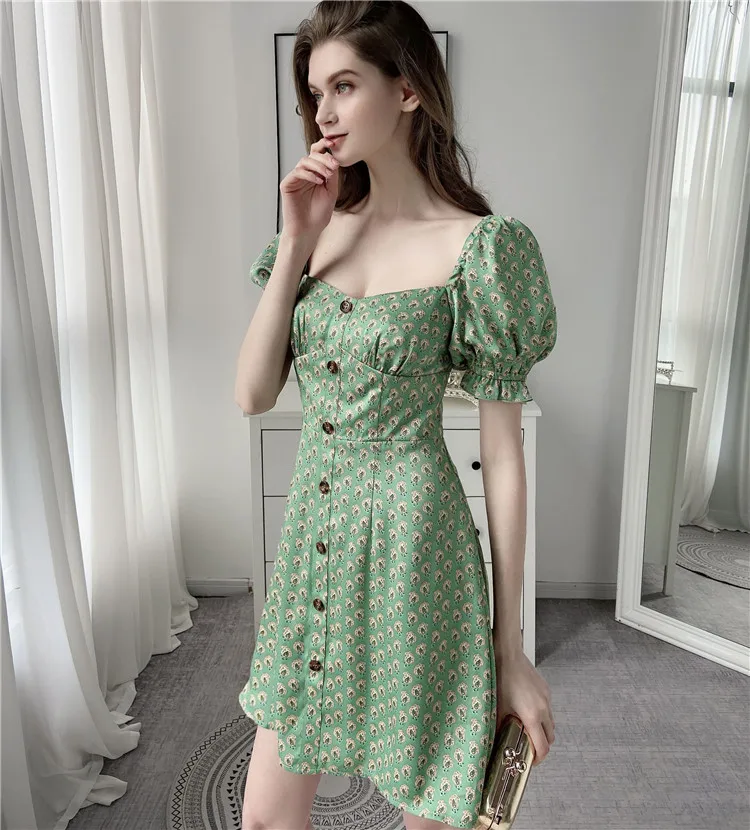 Женское платье трапециевидной формы Dabuwawa, облегающее платье с винтажный буф рукавами на пуговицах и расклешенным принтом, с квадратным вырезом, DT1BDR054