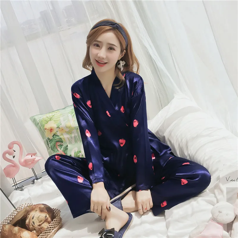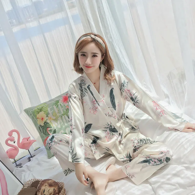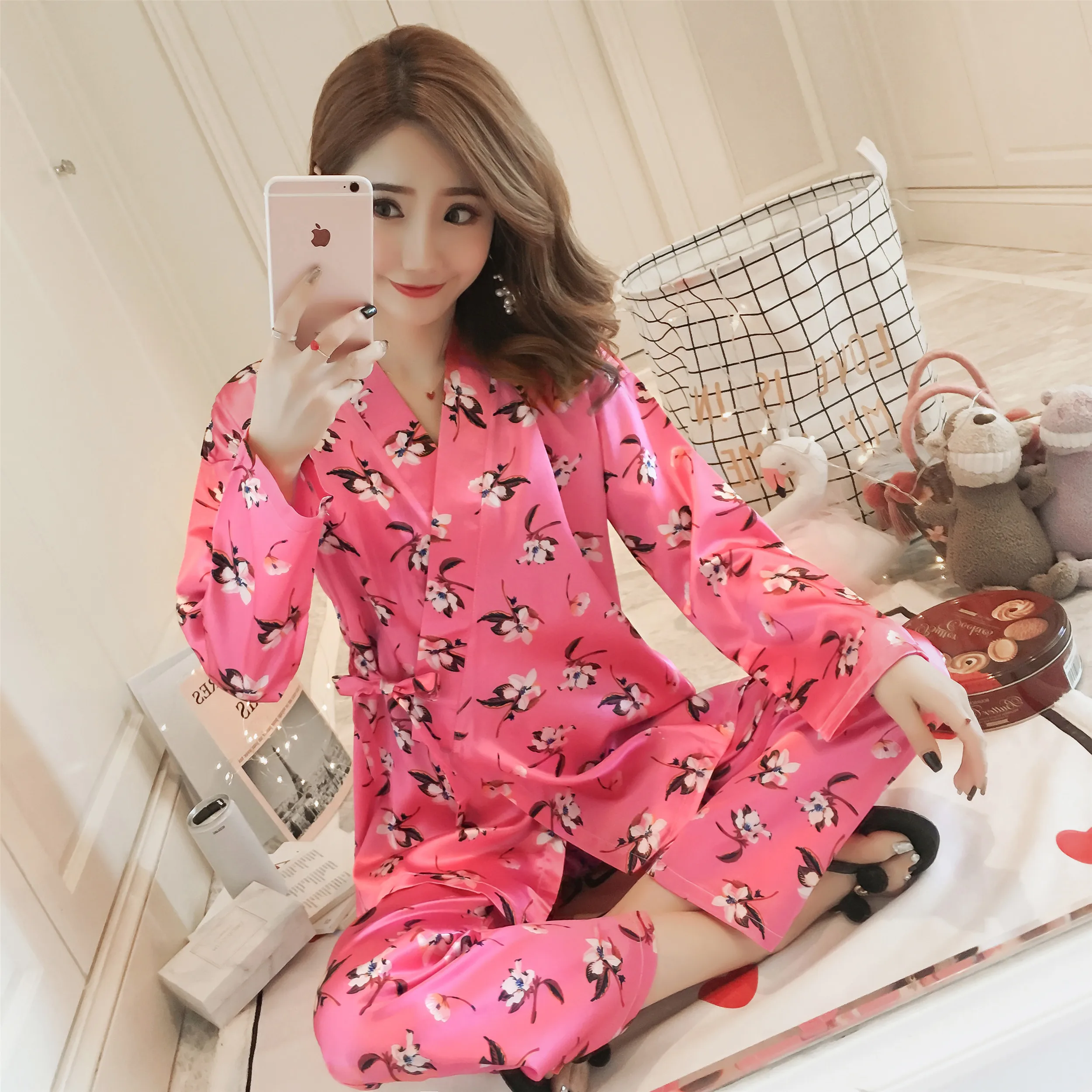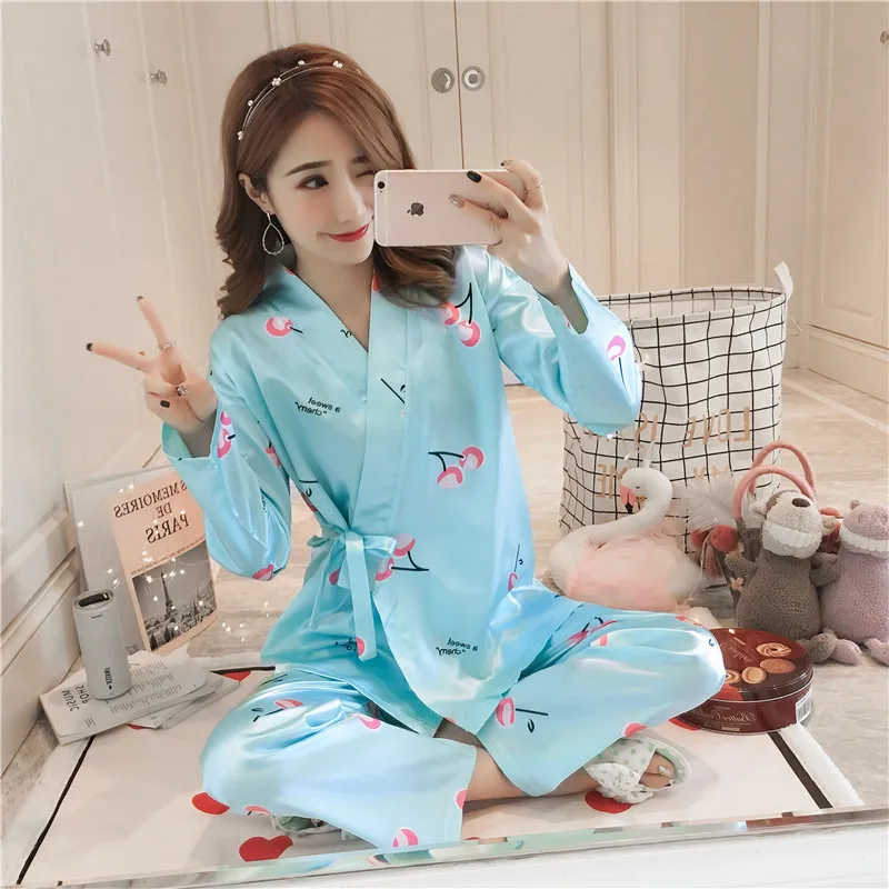 Шелковый пижамный комплект с длинным рукавом, кимоно, стильная одежда для сна с принтом, осень 2020, женская одежда для сна, Повседневная Домашняя одежда, мягкая и удобная Пижама