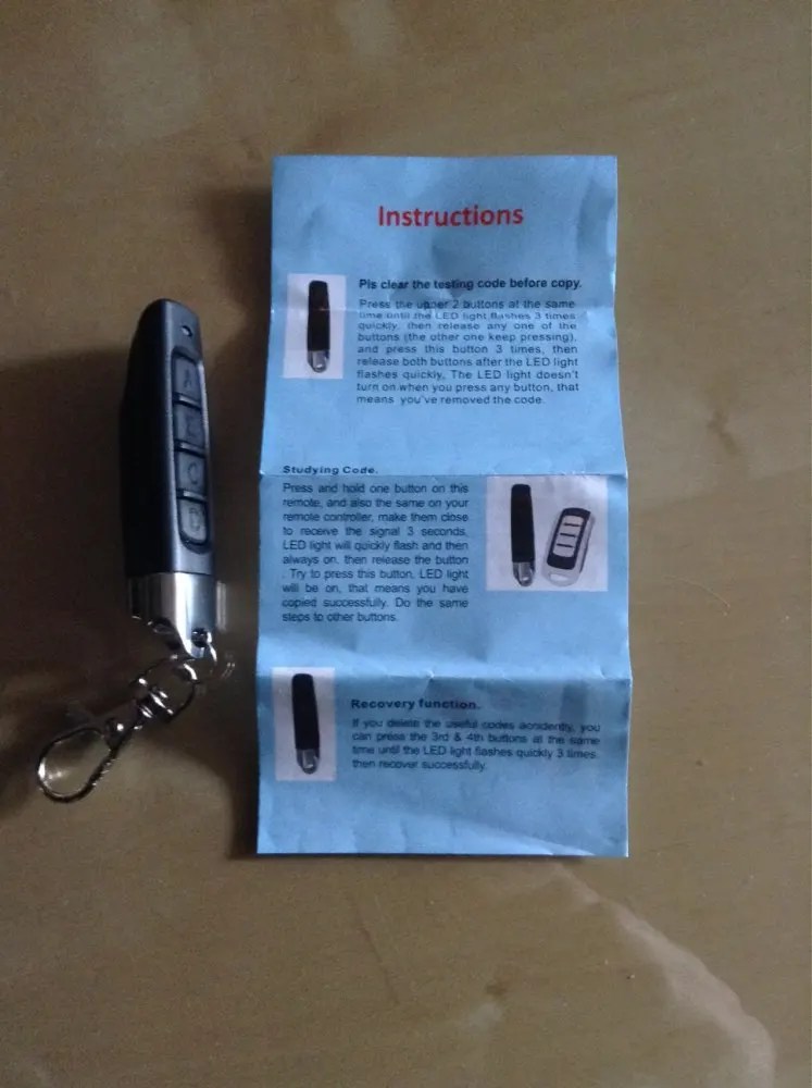 Особенности:1. Простой дизайн и простота использования.2. Небольшой размер и легкий вес, легко носить с пряжкой.3. Этот умный пульт дистанционного управления для копирования подходит для дистанционного управления электрическими дверями, дистанционного управления телескопическими дверями, дистанционного управления гаражными дверями.4. Многофункциональный и многофункциональный, индивидуальный и удобный, простой дизайн и быстрый в использовании.5. Используется для клонирования гаражных ворот, мотоциклов, автосигнализации, средств безопасности дома, устройств беспроводного дистанционного управления ближнего радиуса действия и так далее.