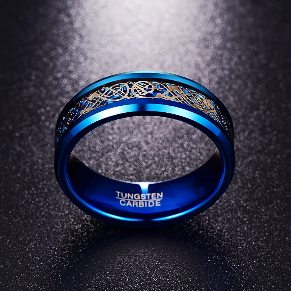 BONLAVIE мужское обручальное кольцо из карбида вольфрама 8 мм золотистого кельтского дракона голубого цвета из углеродного волокна со скошенным краем