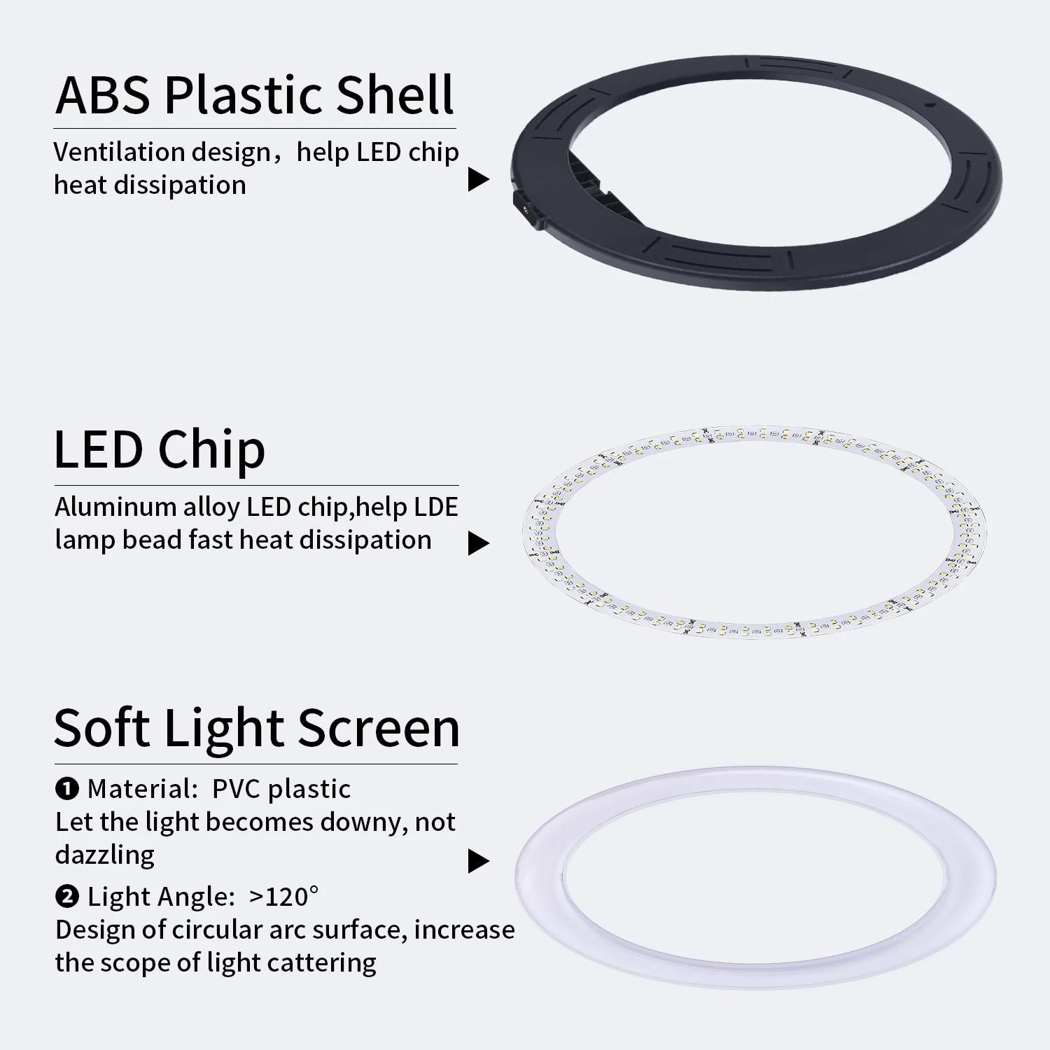 Особенности: 1. Светодиодный кольцевой светильник с подставкой можно установить на держатель и взять его куда угодно. Световое кольцо для селфи с держателем телефона также может быть удалено с подставки в любое время, держатель телефона может свободно регулироваться под любым углом. 2. Кольцевой светильник с подставкой и держателем для телефона изготовлен из 120 энергосберегающих светодиодных бусин, отличное отведение тепла, постоянный ток и высокая цветопередача, смягчает источник света и повышает тонус кожи в портретной фотографии. 3. RGB цвета режим освещения Регулируемая яркость на ваш выбор, вы можете настроить цвет и яркость очень легко, идеальная яркость может быть достигается без установки дополнительных красочных фильтров. Различные цвета мягкого естественного света освещают вашу красоту в разных случаях. 4. Широкое применение: Кольцевой свет для селфи с подставкой для штатива широко применяется для наружного фото света, заполняющего свет в помещении, портрета, моды, рекламной фотографии, съемки видео, прямого потока, макияжа и т. Д. 5. Легкий и портативный дизайн: удобно использовать и переносить во время путешествий или работы на открытом воздухе и т. Д. 6. Функция отвода тепла: даже если селфи кольцо света с держателем телефона используется в течение длительного времени, нет необходимости беспокоиться, что лампа будет горячей. 7. Зажим для телефона подходит для мобильного телефона шириной 5,5-8,5 см. Описание: Модель: FT-33cm rgb-кольцевой светильник Внешний диаметр: 33 см Цветовая температура: 3200-5500K Светодиоды: холодный и теплый цвет лампы бусины: 168 шт; RGB лампы бусины: 70 шт Материал: АБС + пластик Цвет: черный • Мощность: 25 Вт Модель: FT-26cm rgb-кольцевой светильник Внешний диаметр: 26 см Цветовая температура: 3200-5500K Светодиоды: холодный и теплый цвет лампы бусины: 120 шт; RGB лампы бусины: 50 шт Материал: АБС + пластик Цвет: черный Мощность: 20 Вт Модель: FT-20cm rgb-кольцевой светильник Внешний диаметр: 20 см Цветовая температура: 3200-5500K Светодиоды: холодный и теплый цвет лампы бусины: 80 шт.; RGB лампы бусины: 30 шт. Материал: АБС + пластик Цвет: черный Потребляемая мощность: 15 Вт Примечание: мобильный телефон, ноутбук, мобильная зарядка, вилка и компьютер не включены. -Комплектация 1 ( FT-20/26/33 см с 1,6 м штатив): 1x RGB свет (пожалуйста, выберите размер, который вам нужен) Штатив 1,6 м-1 шт. 1x держатель телефона 1x шаровой головкой -Комплектация 2 (FT-20/26/33 см с мини-штатив) 1x RGB свет (пожалуйста, выберите размер, который вам нужен) 1x держатель телефона 1x шаровой головкой 1x Мини штатив-Трипод