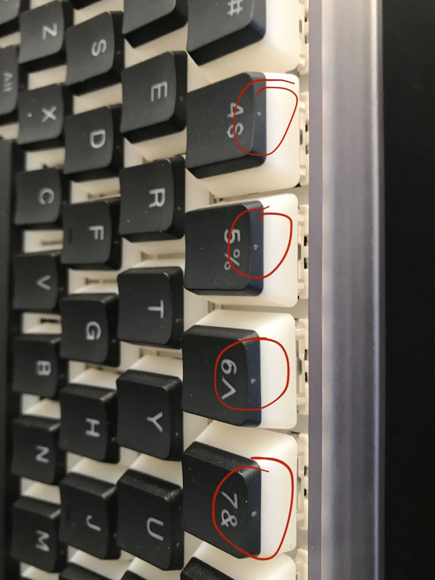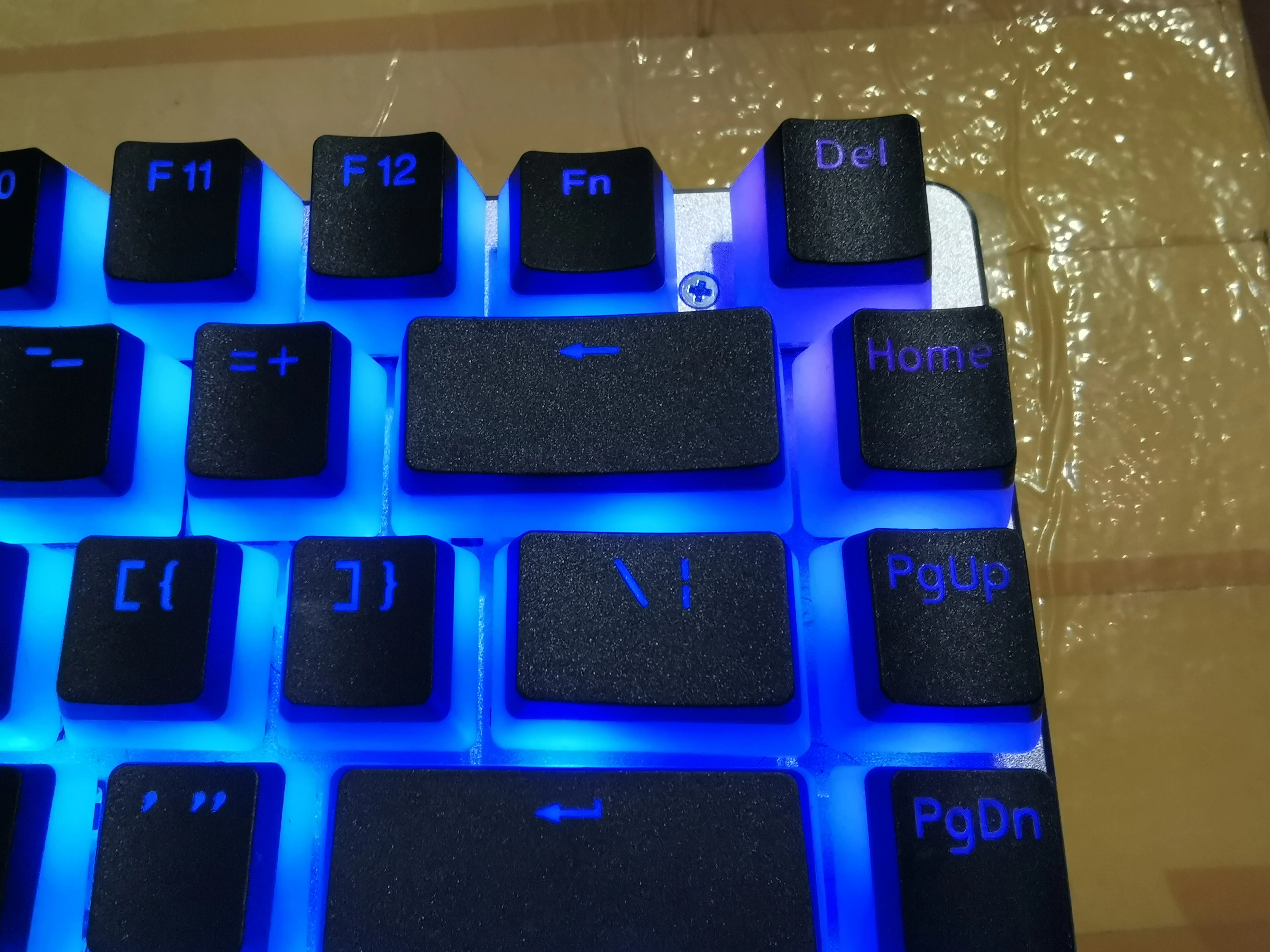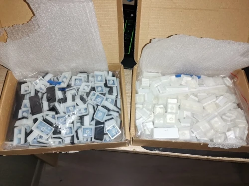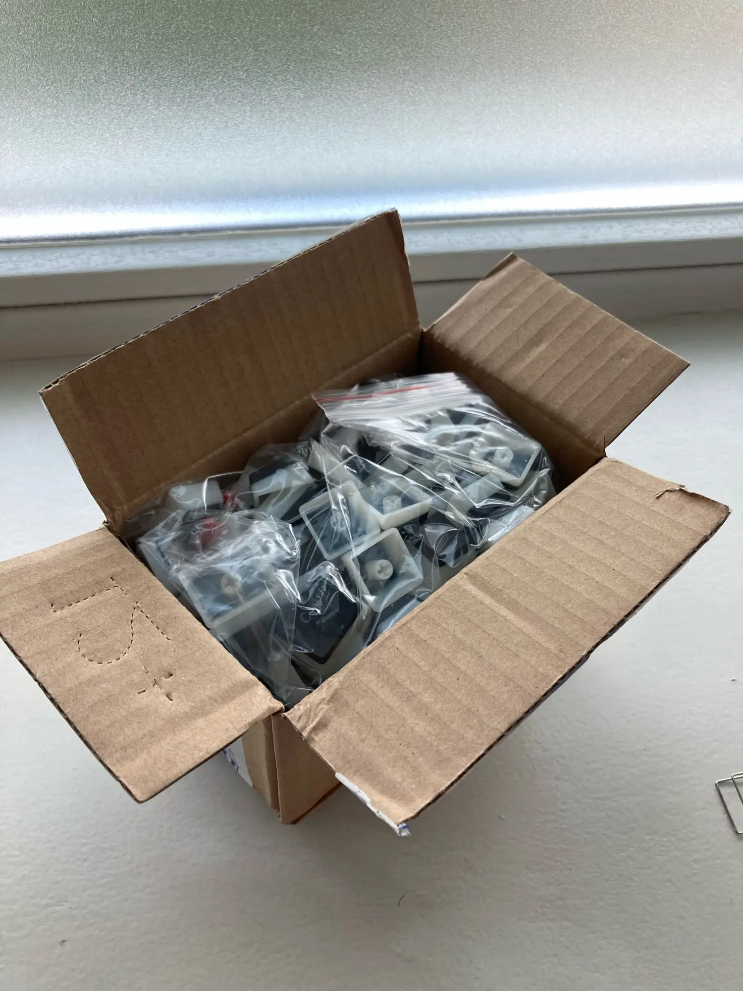 Посылка дошла до МО с момента заказа за 18 дней. Кейкапы находились сваленными в одном пакете, поэтому на некоторых можно увидить лёгкие царапки. Кейкапы белые с скорее серым, а не чёрным пластиком, поэтому без подсветки у символов читаемость ниже. С подсветкой кейкапы смотрятся неплохо. На самих кейкапах на верхней грани есть точки, видимо издержки технологии литья. Даже самый полный набор кейкапов не смог гарантировать совместимость с моей клавиатурой. Но тут сам не досмотрел.