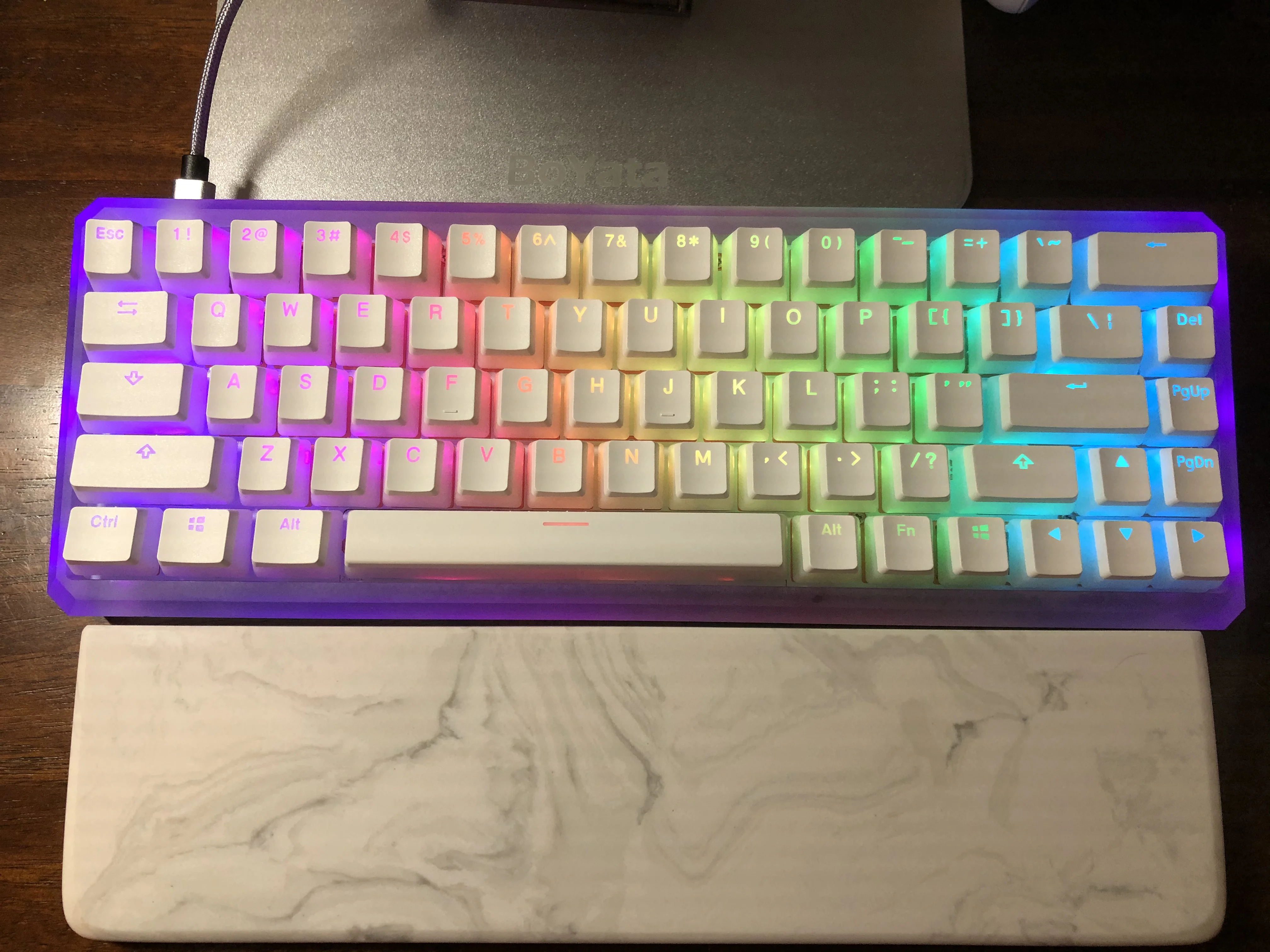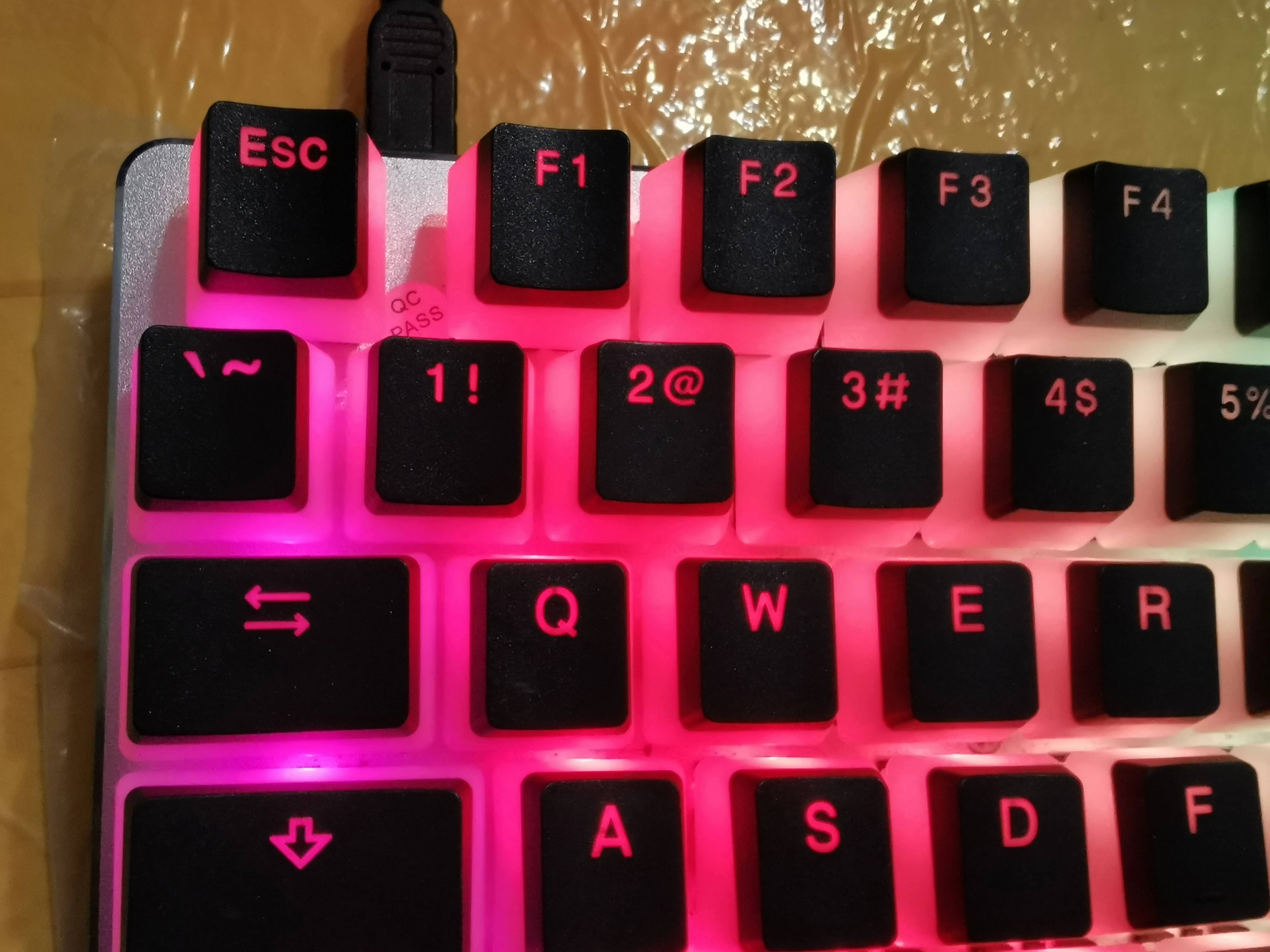 Колпачки были как описано, но качество отделки не является идеальным. Я думаю, что это нормально по цене. RGB свет красиво светит ключи, и продавец был достаточно любезен, чтобы отправить мне запасной пробел, так как у меня был дефект на верхней стороне. Приятный опыт печатания.