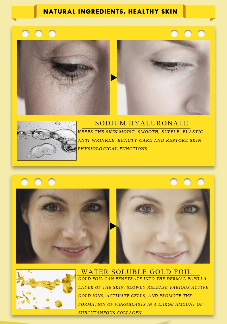 1. Гиалуронат натрияСохраняет кожу влажной, гладкой, упругой, упругой, против морщин, забота о красоте и восстановление кожных PHY сиологических функций.2. Водорастворимая Золотая фольгаЗолотая фольга может проникать в кожный слой папиллы кожи, медленно выделяет различные активные ионы золота, активирует клетки и способствует образованию фибробластов в большом количестве подкожного коллагенового гена.