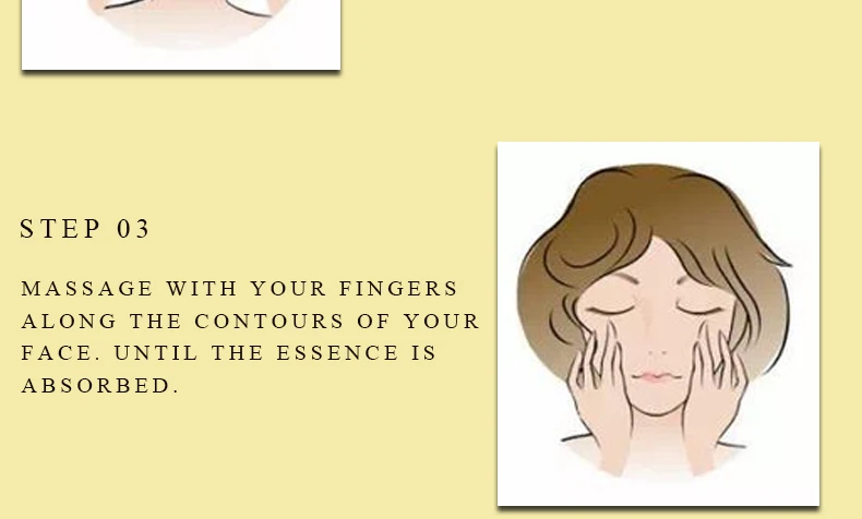 Шаг 01После очищения нанесите необходимое количество эссенции для Y наших H палочек.Шаг 02Нанесите эссенцию на лицо и нанесите ее вдоль контуров лица.Шаг 03Массируйте пальцами по контурам лица Y OU R. До тех пор, пока эссенция не впитывается.