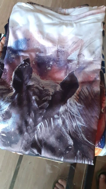 Доставка занимает около трех месяцев. Раздражает. Ткань из 100% синтетической ткани. Лошадь нарисованная крутым образом, на обратной стороне того же изображения. 2xl-европейская женщина.