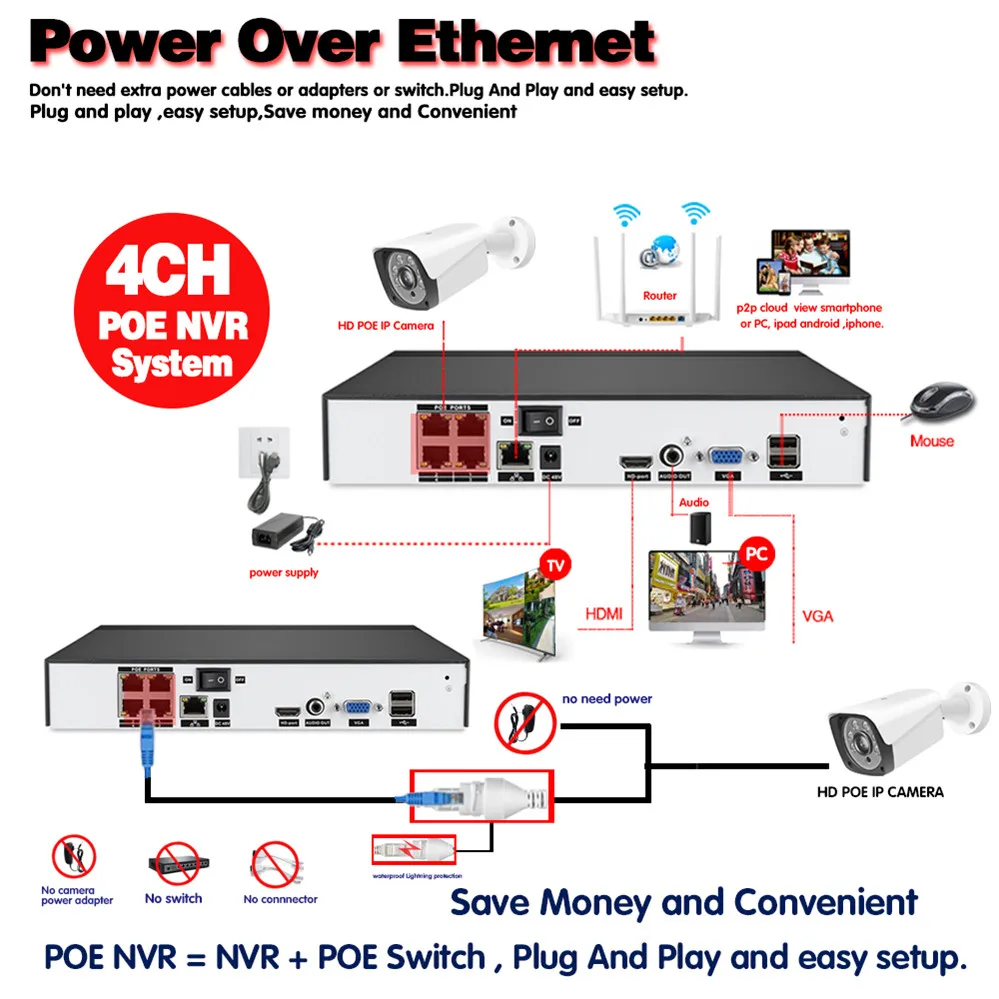 Нет дополнительных кабелей питания или адаптеров, просто подключив ip-камеру к NVR с помощью одного кабеля, вы можете легко завершить установку без знания о компьютере или сети и начать наслаждаться супер простым мониторингом среди вашего смартфона, планшета или ПК.