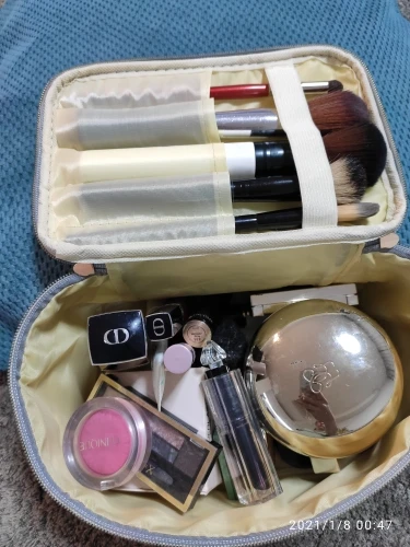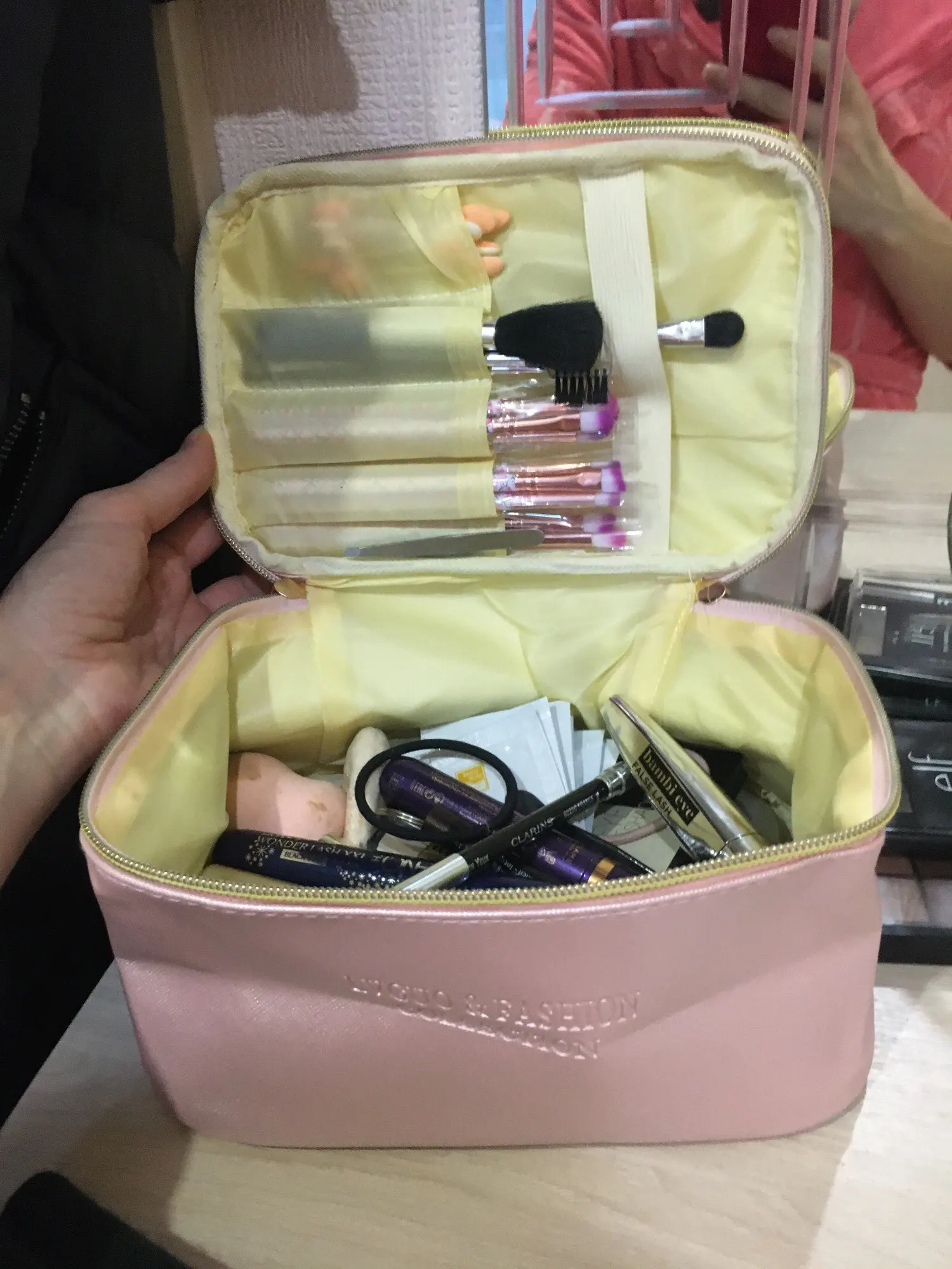 Отличная косметичка,куда вошла вся необходимая косметика(кроме кистей),их лучше хранить отдельно или брать самый большой вариант. смотрится стильно прошито отлично.