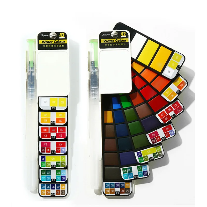 Материал: акварель Название продукта: веерообразная однотонная Акварельная краска Спецификация: 18/25/33/42 цветов Использование: акварельная живопись Тип: краска Применение: Художественная живопись, рекламная цветная живопись, анимационный дизайн, праздничные подарки
