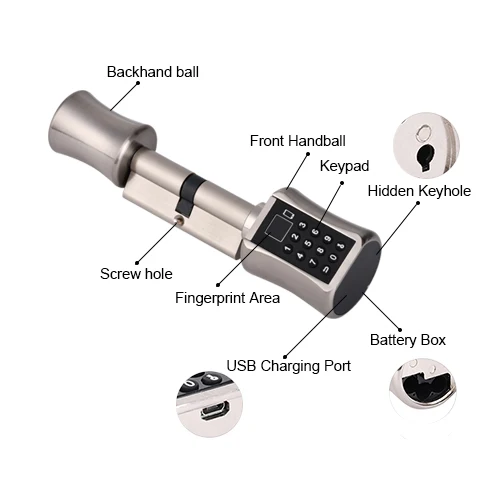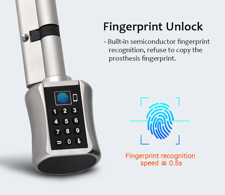 Максимальная поддержка 200 отпечатков пальцев. Изготовлен из высококачественного цинкового сплава, подходит как для безопасных дверей, так и для дверей, деревянных дверей, стеклянных дверей. Поддержка 100000 циклов вращения и надежного тестирования, чтобы убедиться в высоком стабильном и безопасном качестве.