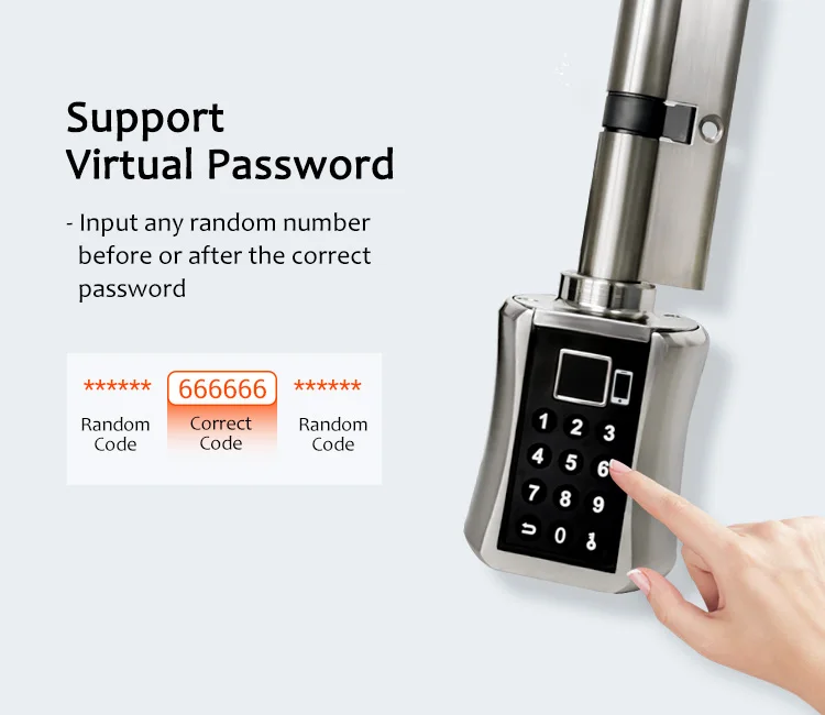 Ациклическая сенсорная клавиатураПоддержка пароля 4-8 цифрПоддержка ввода виртуального пароля Anti-Peeping, ввод случайного пароля до или после правильного пароля, что значительно защищает вашу дверь.