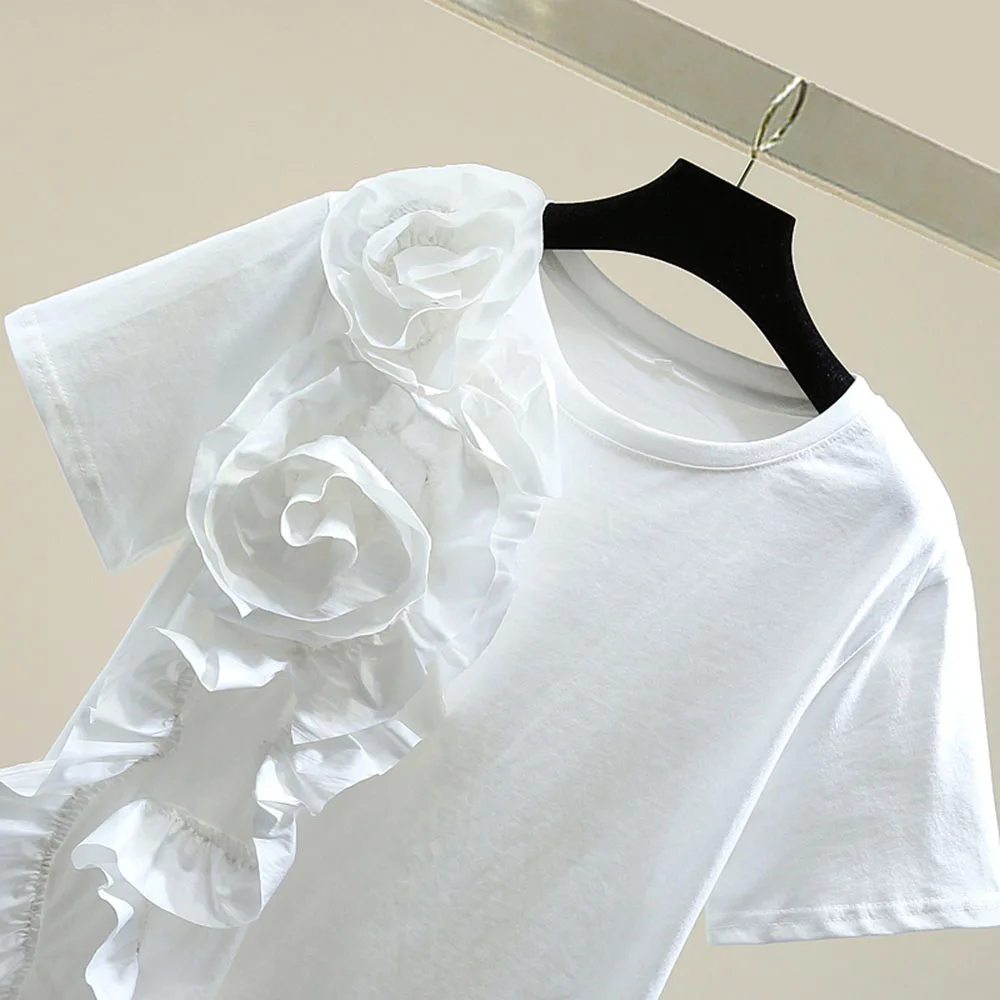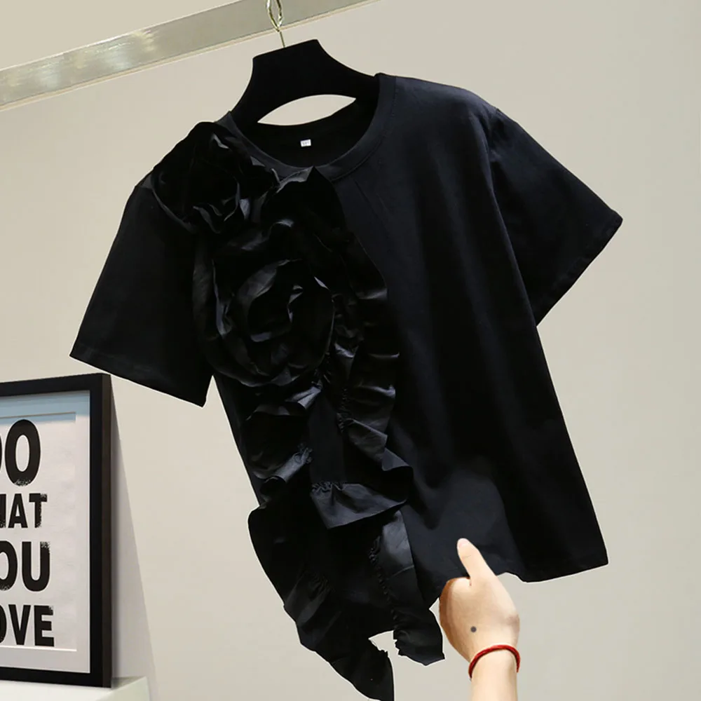 Женская футболка с трехмерными цветами, летняя свободная черная футболка в японском стиле, Модные индивидуальные женские топы с вышивкой в виде грибка, 2020