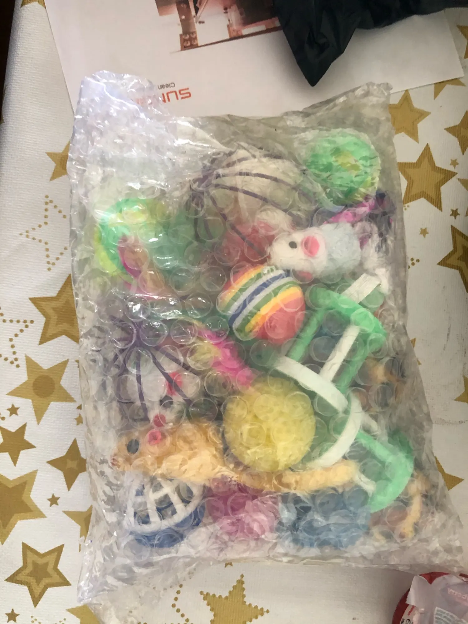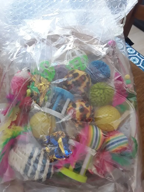 Получил сегодня в колиссимо, Игрушки отличные, я люблю рыболовную собаку с перьями, мои 2 кошки лопаются, я не проверял, с другой стороны, есть 20 игрушек, зная, что я нашел один сломанный (3 фото), Но эй, это не имеет значения, честно говоря, по цене, и доставка в колиссимо стоит того, во Франции это дороже, и есть только 5 игрушек. Я рекомендую, очень хорошо упакованный с пузырчатой пленкой. Спасибо продавцу, я не общался с ним. Очень быстрая доставка.