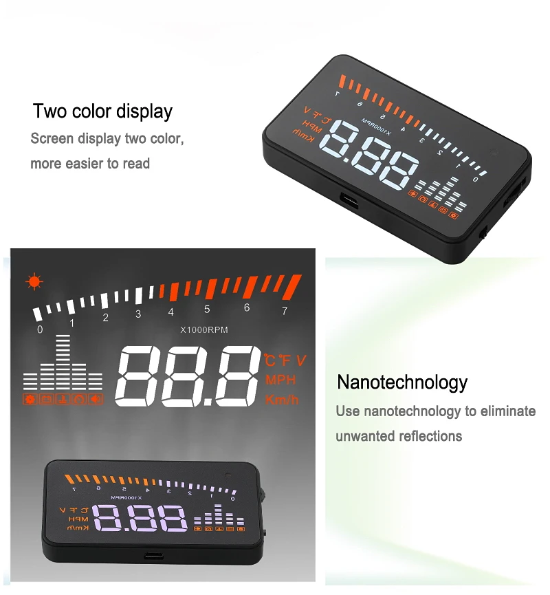 Автоматическая адаптация моделей автомобилей, и может применяться для автомобилей в соответствии с OBD II или EUOBD (Бортовая Система автоматической диагностики).Plug and Play. 3-дюймовый экран и дисплей высокой четкости Многоцветный дизайн делает экран более изобильным и легким для чтения Использование нанотехнологий для устранения нежелательных отражений и может сделать информацию на дисплее более острой. Отображение насыщенного контента: скорость, скорость двигателя, температура воды, напряжение батареи, Сигнализация низкого напряжения, сигнализация высокой температуры, сигнализация скорости, свободное переключение между километром и милей, свободное переключение между цельсием и фаренгейтом. Автоматическое включение и выключение при запуске и отключении транспортного средства, эффективная защита аккумулятора автомобиля; При этом сохраняет режим ручного переключения, и более прост в управлении HUD. Автоматический и ручной режим регулировки яркости, езды без бликов.Спецификация:
