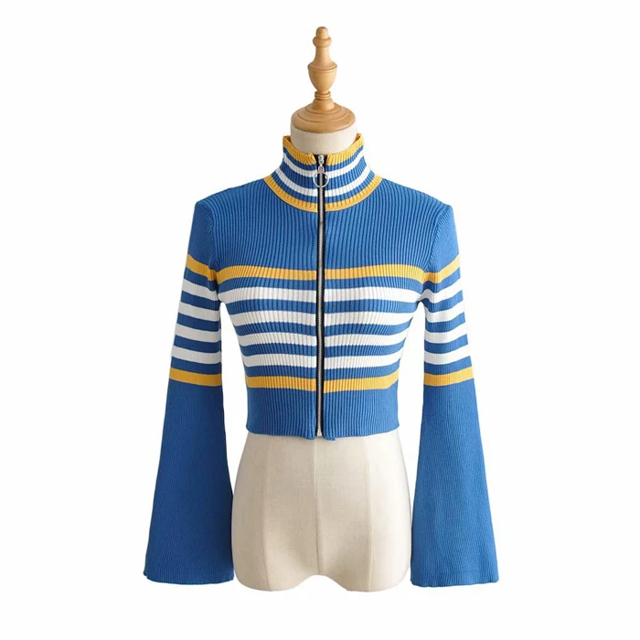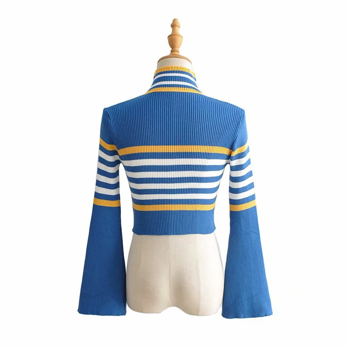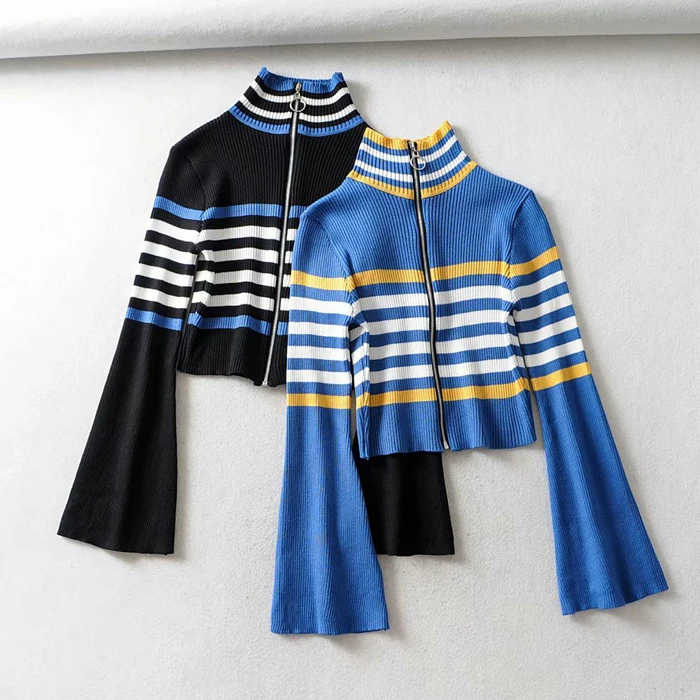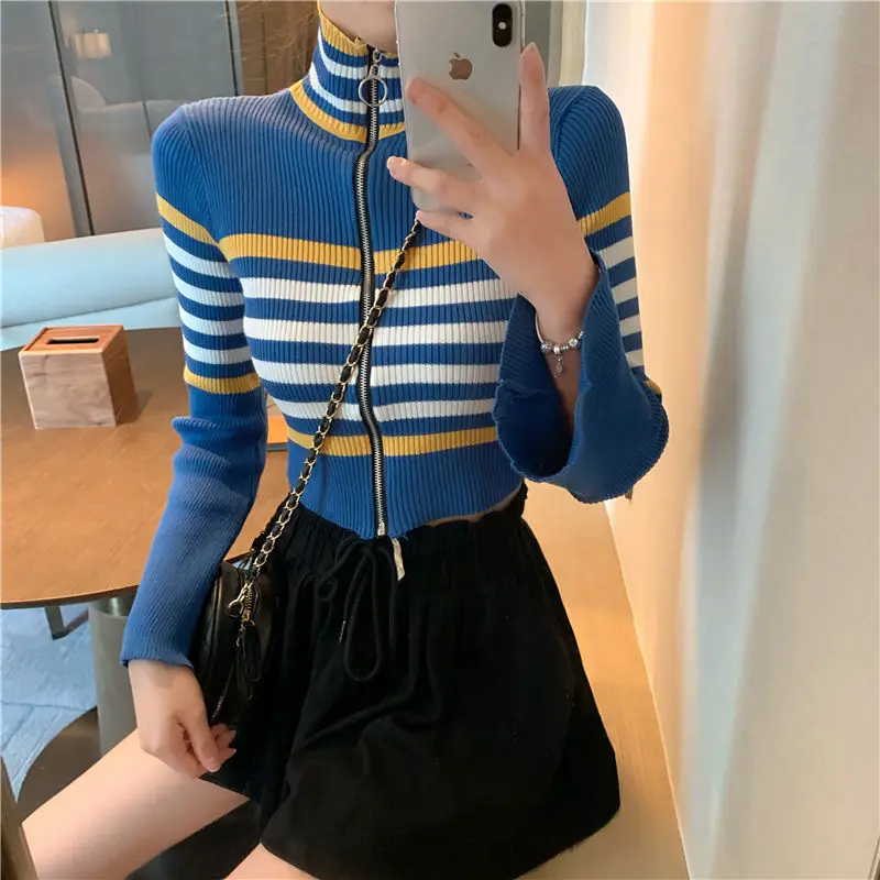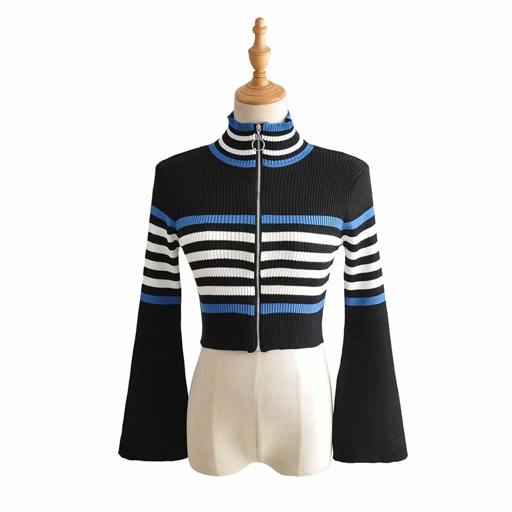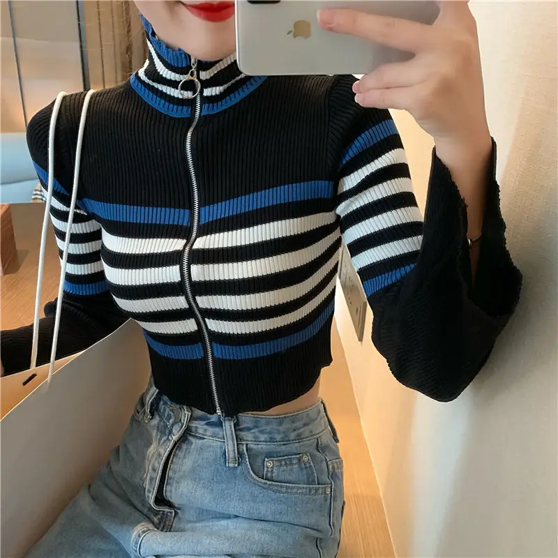 Водолазка, вязаные женские осенние свитера, винтажные, расклешенные, с длинным рукавом, в полоску, тонкие пуловеры, на молнии спереди, джемперы, pull femme, топы