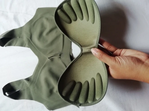 Здравствуйте. Материал, который сделан, приятный на ощупь, очень удобный, чаша уникальна (остальные, которые я покупаю, обычно поставляются с разделяющей чашей посередине), чашу можно снять. Я купил Размер 2XL, он был немного туго, обычно я использую бюстгальтер 80D / 85D (в зависимости от бренда) здесь, в Европе.