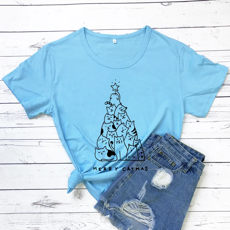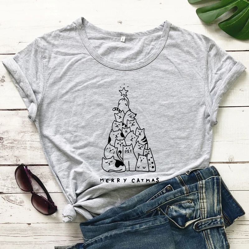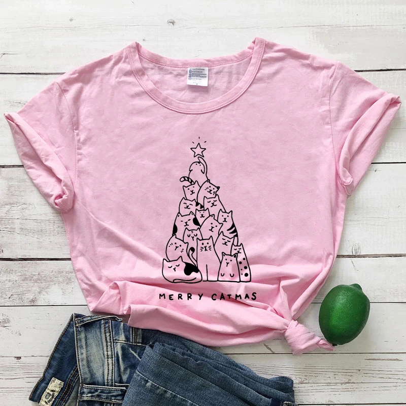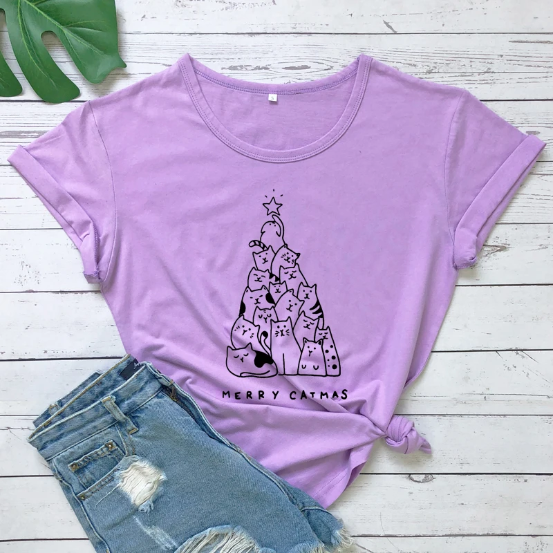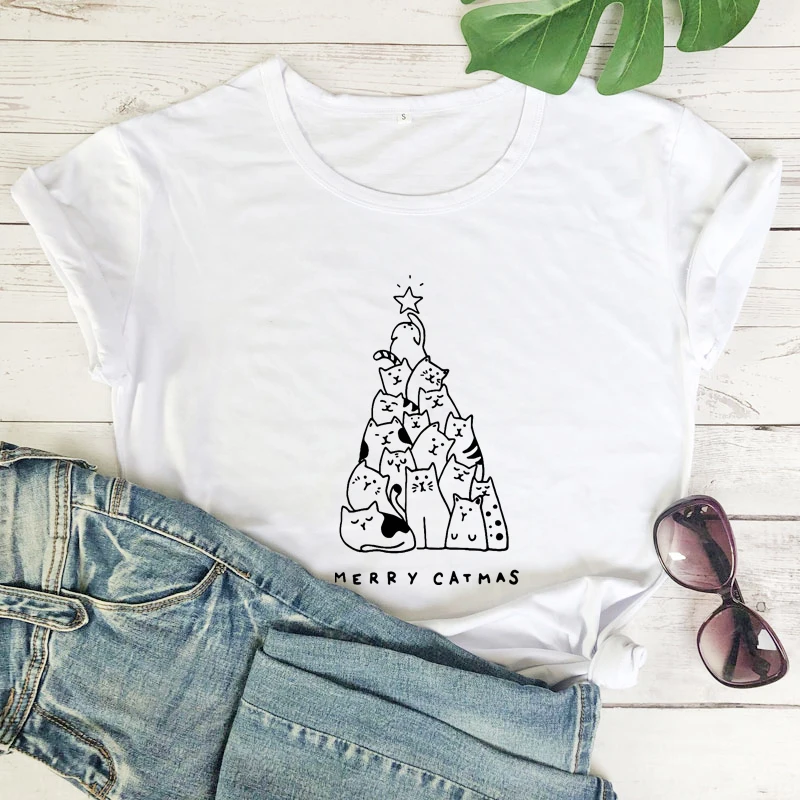 Рождественская футболка с надписью Merry Catmas из 100% хлопка, Рождественская футболка с милым котом и елкой, забавная женская зимняя праздничная подарочная футболка
