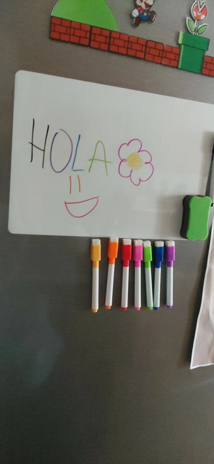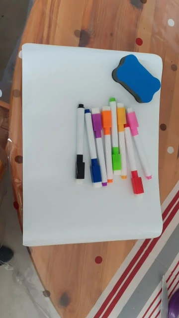 Он прибыл очень быстро и в отличном состоянии, Идеальная упаковка, потому что он поставляется в трубе, которая полностью защищает его, И он также поставляется с восьми маркерами каждый со своим магнитом и его ластиком в конце маркера, а также с большим магнитным ластиком, чтобы иметь возможность прилипать к доске. Он очень легко прилипает к холодильнику, как вы можете видеть на фотографии, которая прилагается здесь, и по цене, которую он имеет, я думаю, что это хорошая покупка.