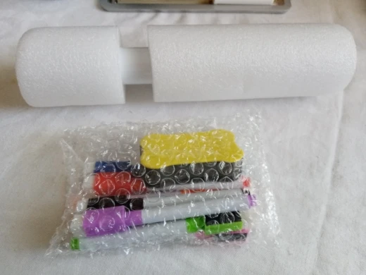 Super fast shipping and delivery, the parcel arrived in France only 9 days after my order. The whiteboard was well protected, rolled into a foam tube. It came with 8 pens and one magnetic eraser. The magnets are not super strong, but I have placed the whiteboard on the horizontal door of my freezer so it is fine. The pens write well and the marks are easily cleaned. Very satisfied.
