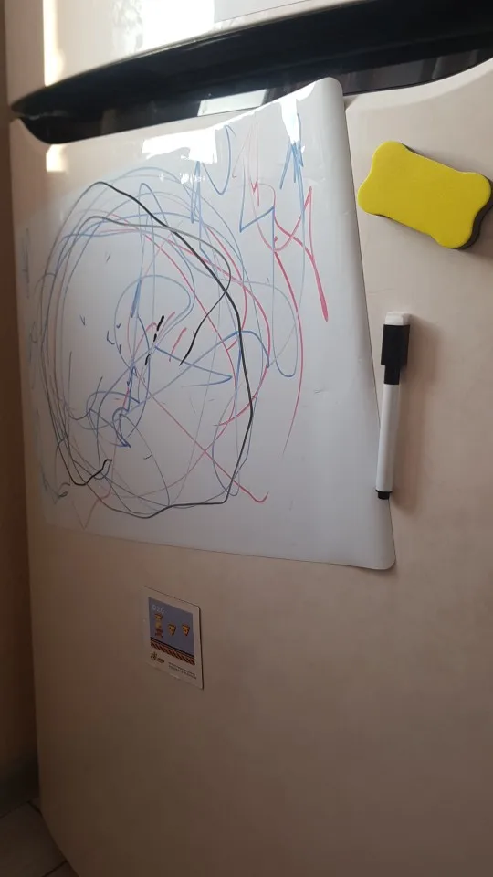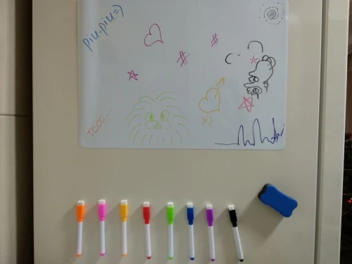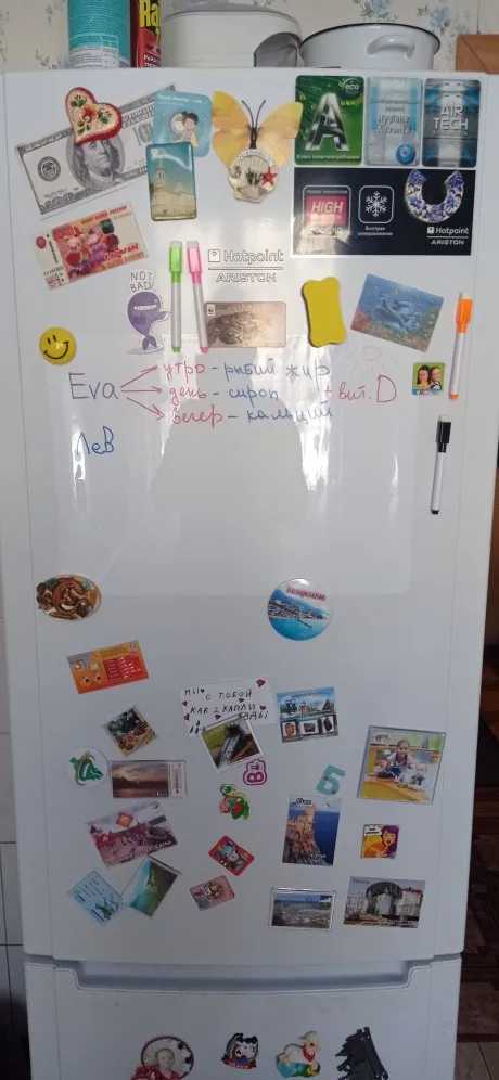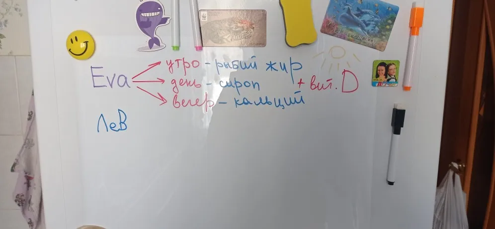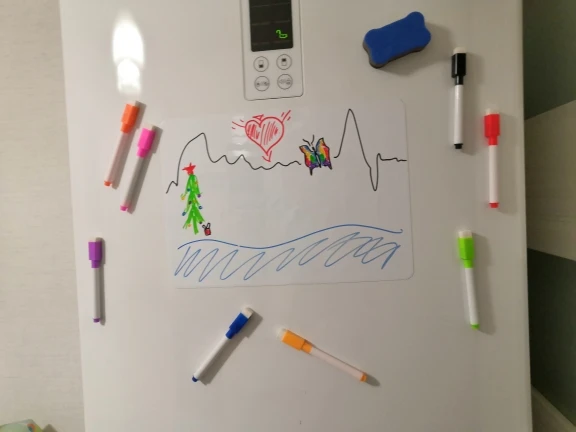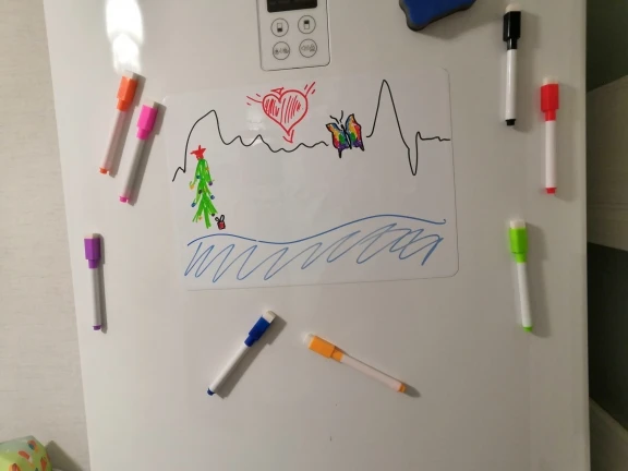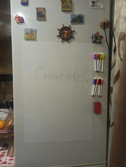На доске есть заусенцы, за пару дней выпрямилась на холодильнике. Некоторые маркеры слишком светлые, магниты у них слабенькие. В целом доволен