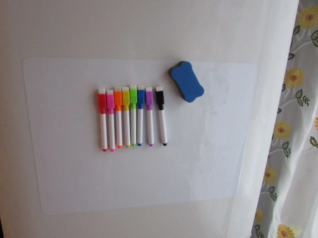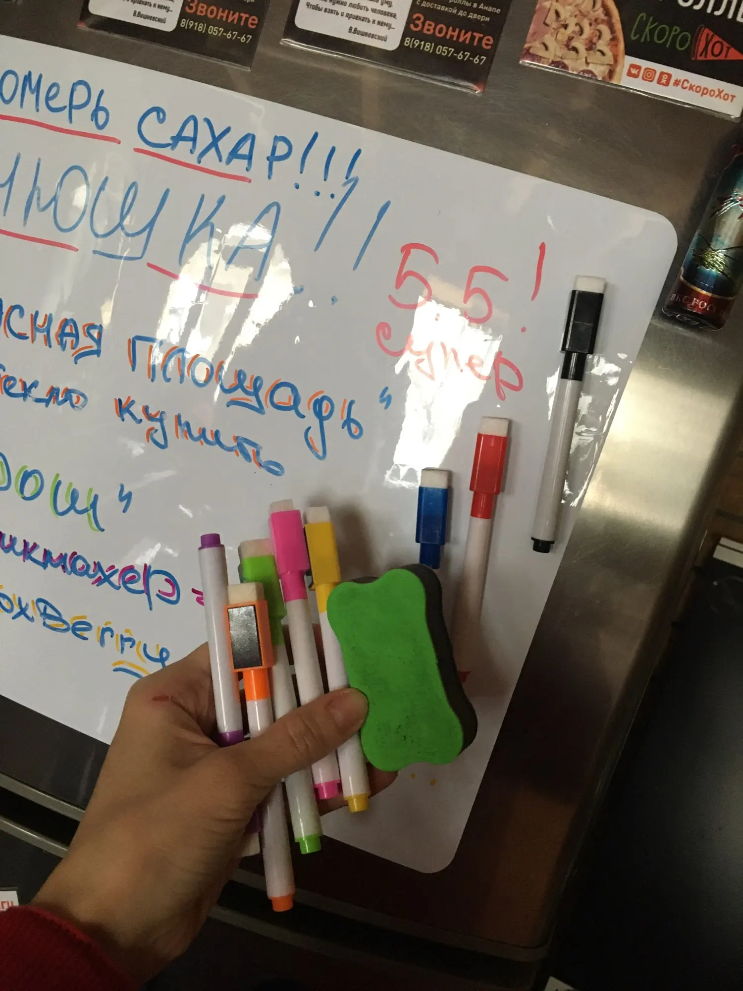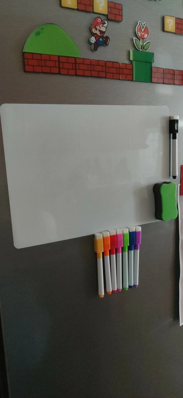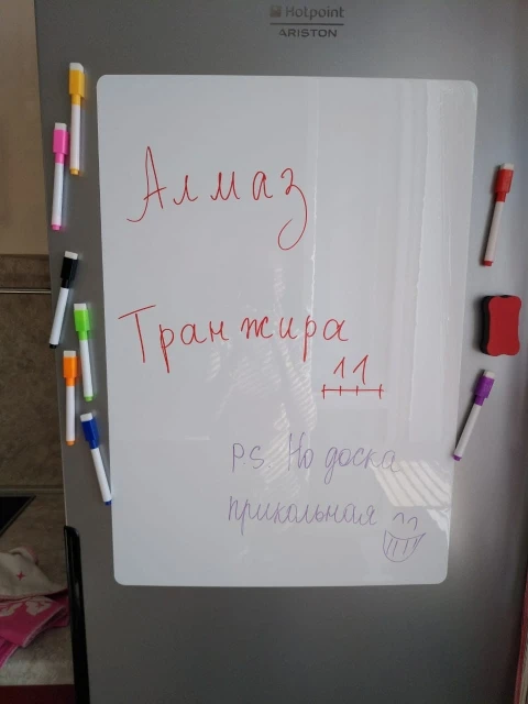 отличная магнитная доска,приехала достаточно быстро,мне кажется это самое дешевое,что я нашла на алиэкспресс,губка,8 фломастеров,ну и сама доска,без повреждений,размер А3,хорошо приклеилась к холодильнику,очень удобно писать важное,чтобы не забыть