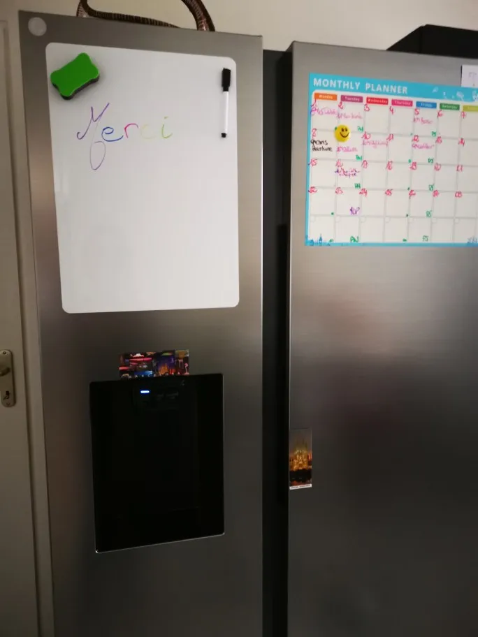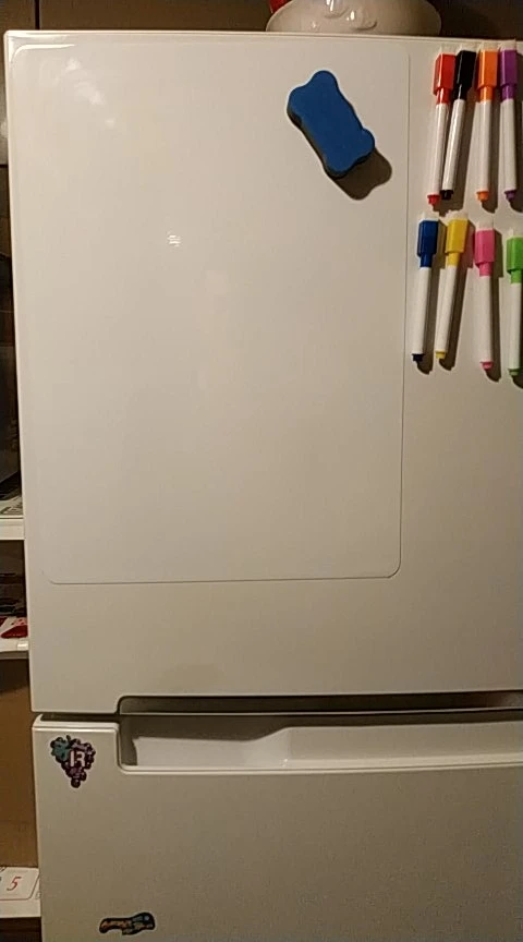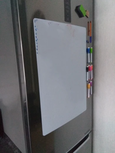Отличный продукт (комплект) лист прибыл очень хорошо упакованным, чтобы избежать промокания. На фото мы видим клей пузырьков сверху и снизу, но это сразу после его установки. Вы должны оставить ему время, чтобы хорошо вписаться в холодильник. Протестированы карандаши, пишут и легко стираются, чтобы увидеть, если они остаются более длинными, они стираются так же хорошо. Магниты губки и листы хороши, хотя в некоторых местах это работает менее хорошо. Я думаю, что плотность железа холодильника (потому что я также смог проверить на другом холодильнике, где они висели больше) очень доволен своей покупкой € 6,26. Спасибо продавцу!