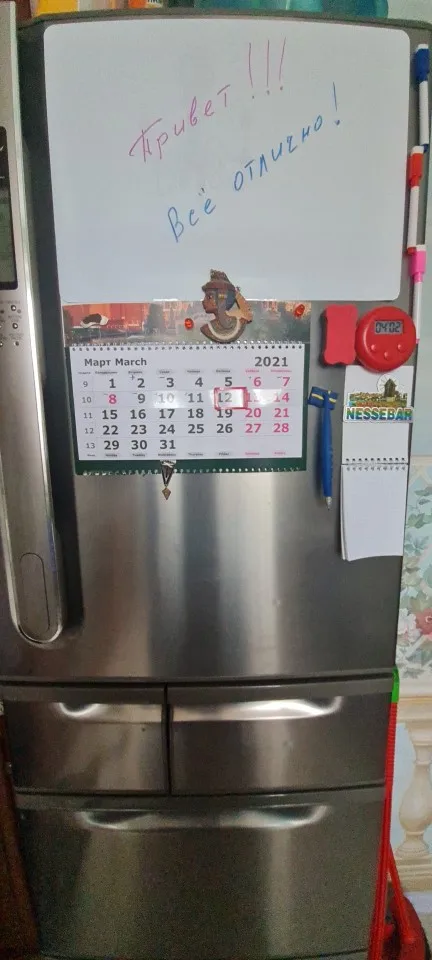 Пришло очень быстро. Упаковано хорошо, свёрнуто и засунуто в мягкую обложку. К сожалению очень хрупкое, пока доставал, пока разворачивал - появились заломы, на которых остаётся маркер (его не стереть тряпкой, только если какой-нибудь жидкостью). Будьте аккуратнее, когда начнёте распаковывать - сразу вешайте на холодильник, само распрямится. Самая доступная цена, насколько я успел заметить. В комплекте много маркеров различных цветов и тряпочка для стирания.