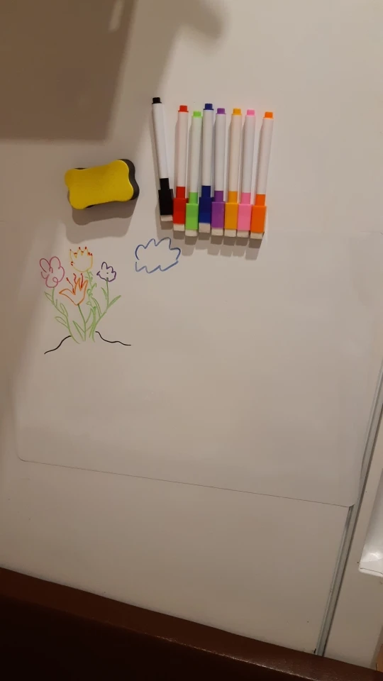 Прикольная! Магнитится хорошо. Все маркеры на магнитах , все рисуют хорошо, ярко. Губка тоже на магните, стирает хорошо. Довольны. Так как приходит доска свернутая в рулон, немного помятые заломы, но, в принципе, особо не беспокоят. В Санкт-Петербург за 19 дней. Рекомендую!!