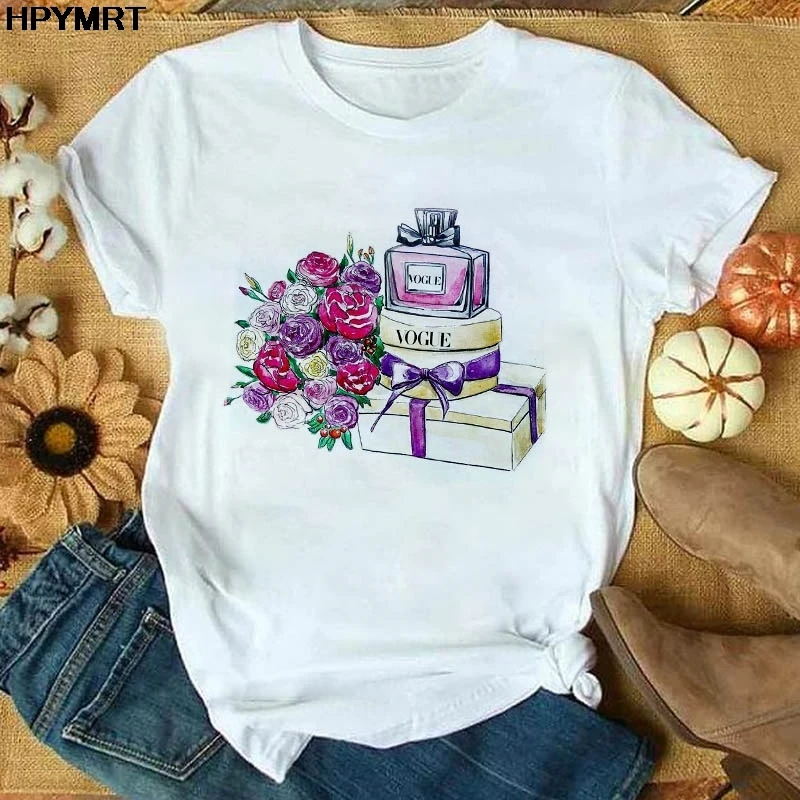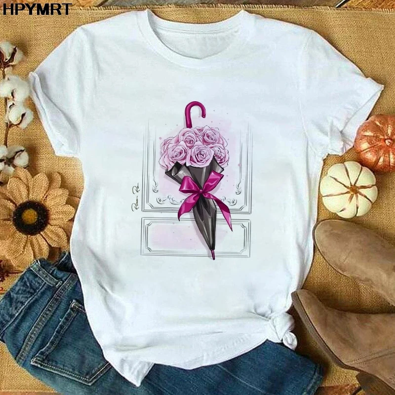 Белая футболка, женская новая летняя футболка с цветочным принтом и зонтиком, женские топы с коротким рукавом, женская футболка с графическим рисунком, женская футболка с круглым вырезом