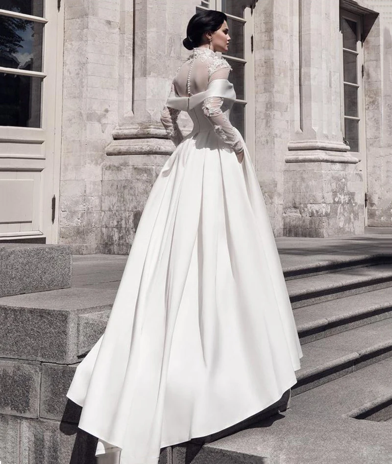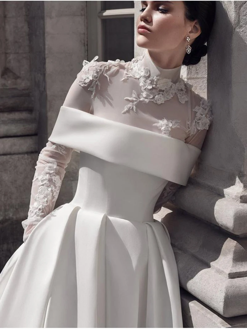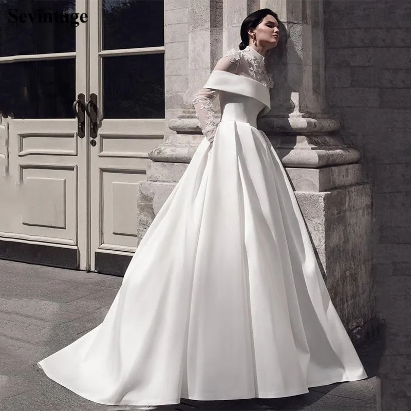 Мусульманское свадебное платье Sevintage с высокой горловиной, мягкое атласное платье с длинными рукавами и цветочным принтом, кружевное платье невесты, индивидуальный пошив, большие размеры