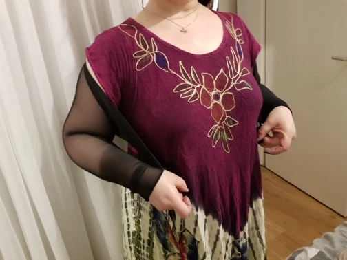 Классный топ. Хорошее качество. До Сахалина дошёл за три недели. Тянется отлично. Подошёл даже на мой размер 56. Но на сильно полные руки нужно будет помощь постороннего человека. Заказывала хл