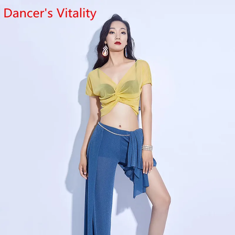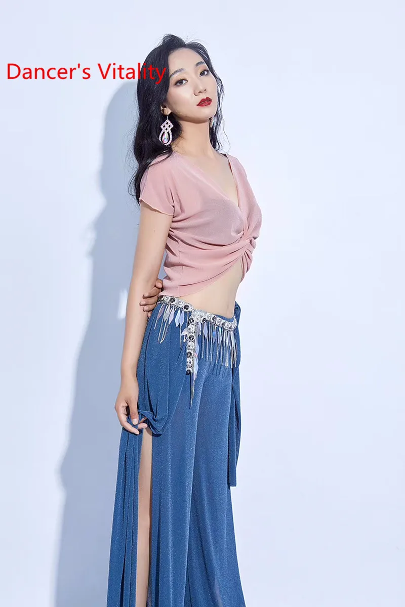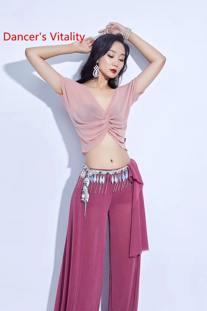 Новинка, костюм для восточных танцев, женский костюм для танца живота, сексуальный серебристый Топ с короткими рукавами, длинные брюки, танцевальный костюм для соревнований