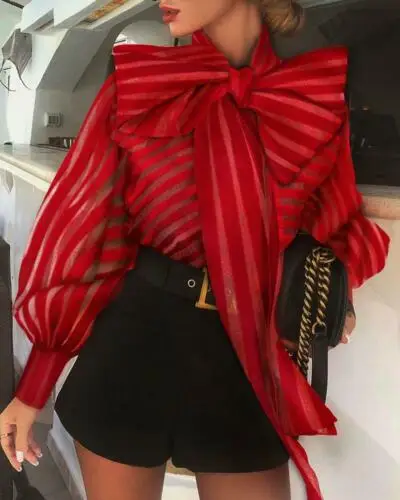 Женская одежда, топы, сетчатая прозрачная полосатая блузка, Прозрачный Топ с длинным рукавом, модная черная красная рубашка с большим бантом для женщин
