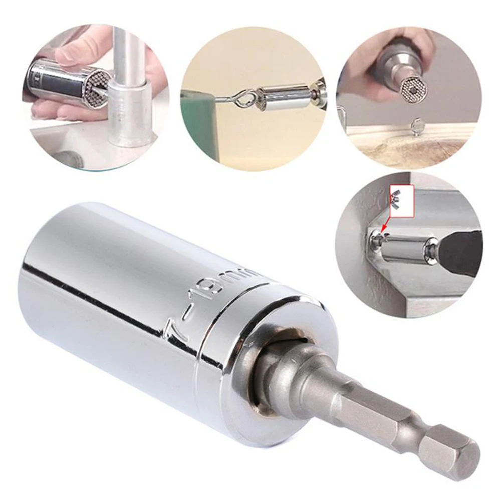 Универсальный адаптер для розетки может самостоятельно настроить, чтобы соответствовать тысячам крепежных элементов. Адаптер питания преобразует электрическую дрель в источник питания. Гаечный ключ с накатанной нескользящей ручкой прост в эксплуатации с небольшим усилием. Полированная хромированная отделка обеспечивает высокую прочность и долговечность. Подходит для стандартных 1/4-3/4 дюймовых и метрических 7-19 мм гаек и болтов.
