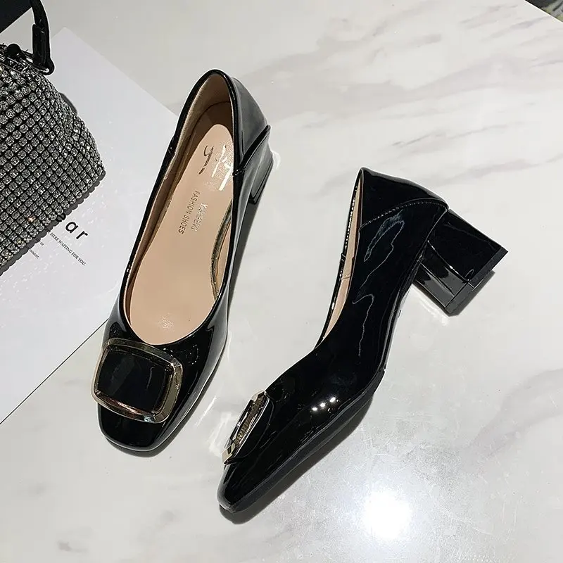Офисные женские туфли из органической кожи; Женские туфли-лодочки; Водонепроницаемые туфли из лакированной кожи на среднем каблуке; Тонкие туфли; Модельные туфли на не сужающемся книзу массивном каблуке; Большие размеры; 8355N