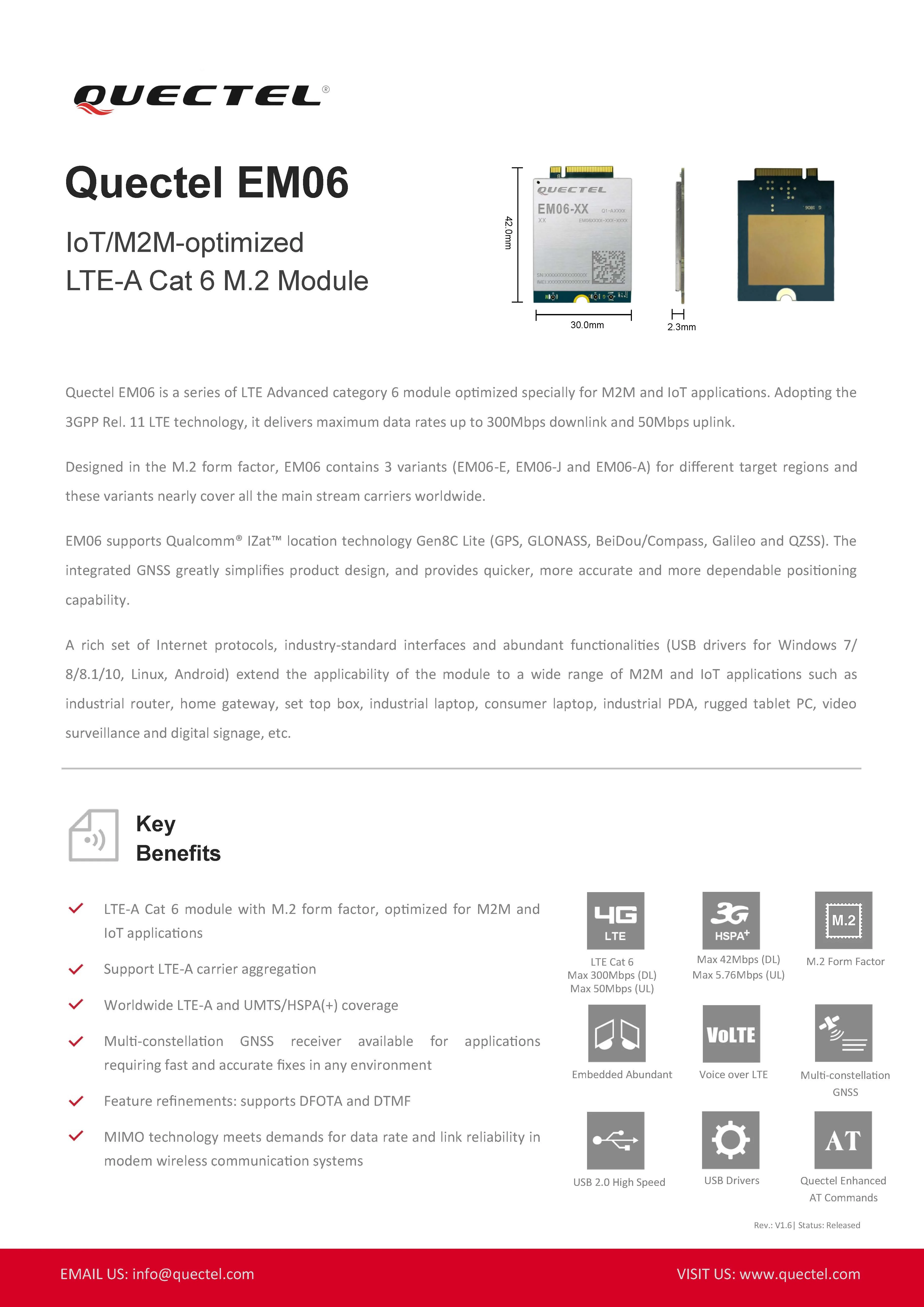 Quectel EM06-это серия модулей расширенной категории 6 LTE, оптимизированных специально для приложений M2M и IoT. Использование 3GPP Rel. Технология 11 LTE обеспечивает максимальную скорость передачи данных до 300 Мбит/с и восходящий канал 50 Мбит/с. Разработанный в форм-факторе M.2, EM06 содержит 3 варианта (EM06-E, EM06-J и EM06-A) для разных целевых регионов, и эти варианты почти охватывают все основные носители потока по всему миру. EM06 поддерживает технологии определения местоположения Qualcomm® IZat™ Gen8C Lite (GPS, GLONASS, BeiDou/Compass, Галилео и QZSS). Встроенный GNSS значительно упрощает дизайн продукта и обеспечивает более быстрые, точные и надежные позиционирования. Богатый набор интернет-протоколов, стандартных интерфейсов отрасли и обильных функций (USB-драйверы для Windows 7/8/8.1/10, Linux, Android) расширение применимости модуля к широкому спектру M2M и IoT приложений, таких как Промышленный маршрутизатор, домашний шлюз, телеприставка, промышленный ноутбук, потребительский ноутбук, промышленный КПК, Прочный планшетный ПК, видеонаблюдение, цифровые вывески и т. д. Ключевые преимущества ● модуль LTE-A Cat 6 с форм-фактором M.2, оптимизирован для приложений M2M и IoT ● Поддержка LTE-A агрегирования носителей ● по всему миру LTE-A и UMTS/HSPA(+) Покрытие ● приемник GNSS с несколькими созвездиями доступен для приложений, требующих быстрых и точных исправлений в любой среде ● Улучшение функций: поддержка DFOTA и DTMF ● технология MIMO отвечает требованиям скорости передачи данных и надежности каналов в модемных системах беспроводной связи