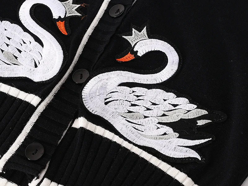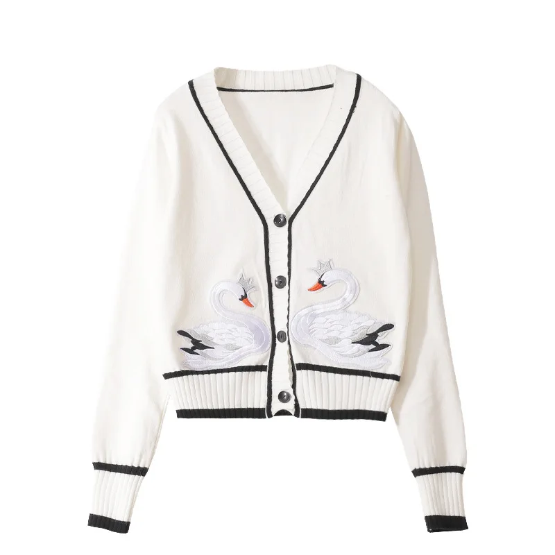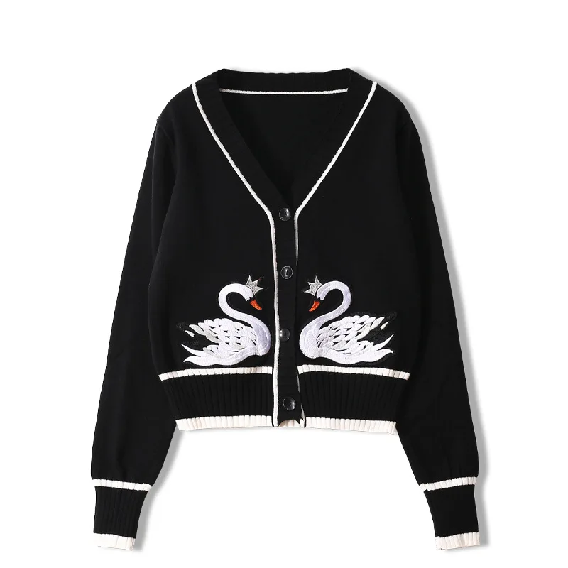 Женский кашемировый кардиган, тонкий вязаный жакет средней длины с Лебединым принтом и V-образным вырезом