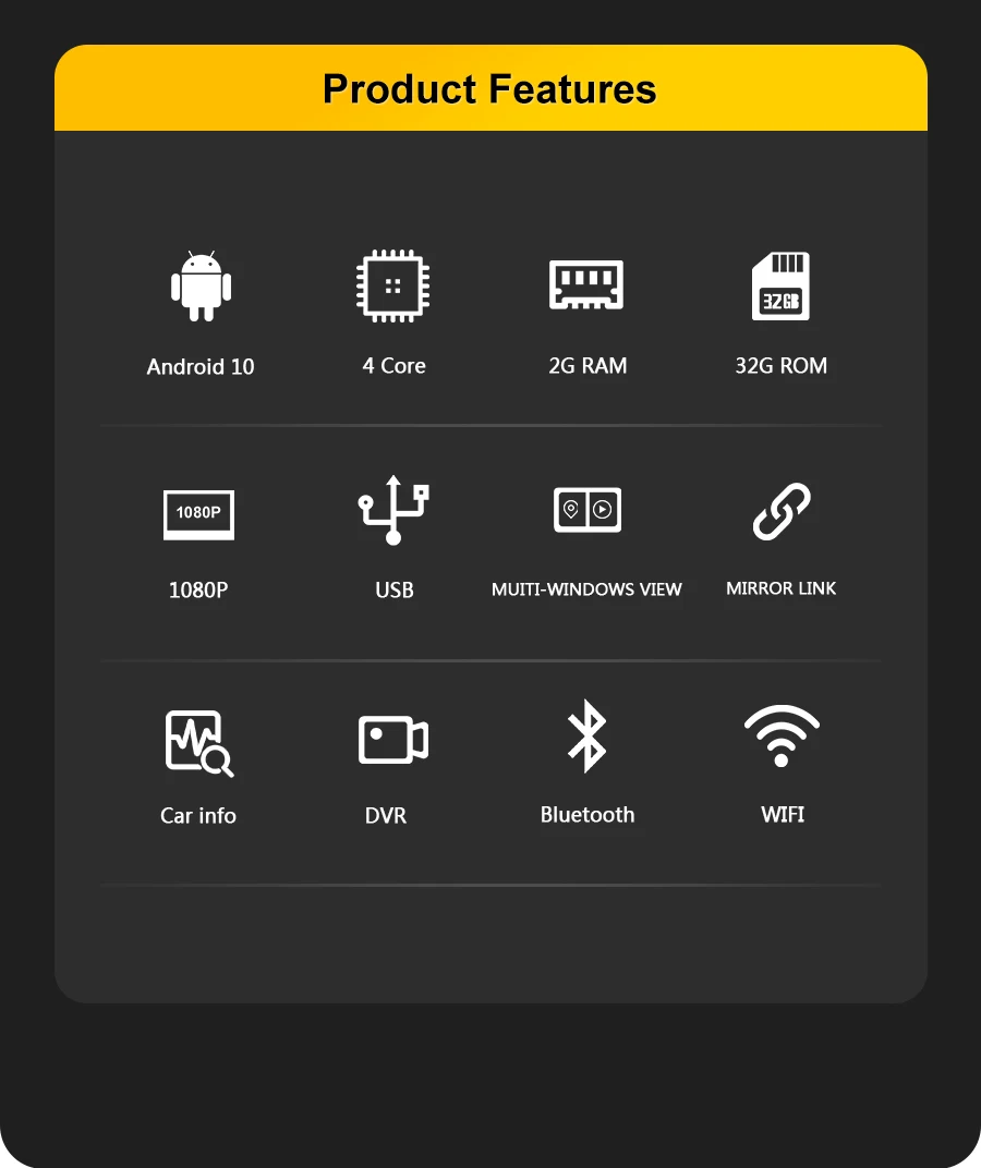 4 ядра 2 Гб RAM 32 ГБ ROM с USB carplay, не поддерживает 3G/4G слот для sim-карты