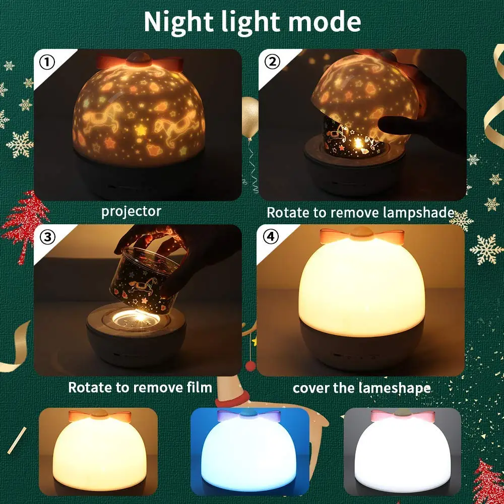 Сначала не понял, почему не светится на стенах изображения, потом догадался снять колпак . Подсветка очень красивая, разные режимы. Питается по usb, есть встроенный аккум, когда заряжен - цвет индикатора меняется с красного на зелёный. Позже попробую запитать от сети через usb-вилку от старого телефона. Кнопок три: цвет подсветки, вращение, вкл./выкл.. У меня модель со звуком, на дне находится заводной механизм, пока не пробовал.