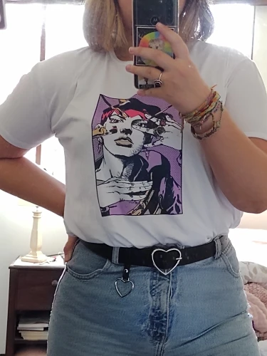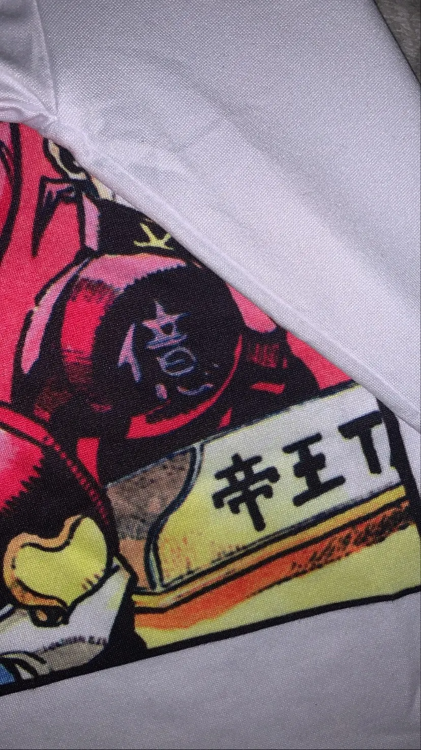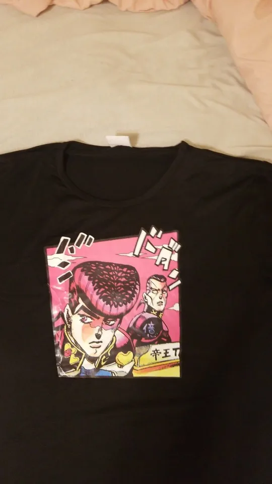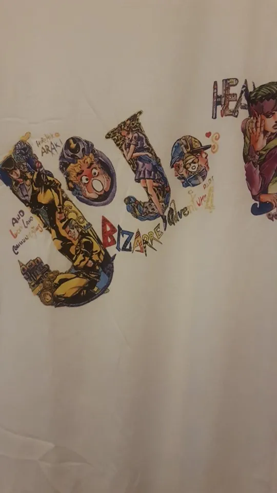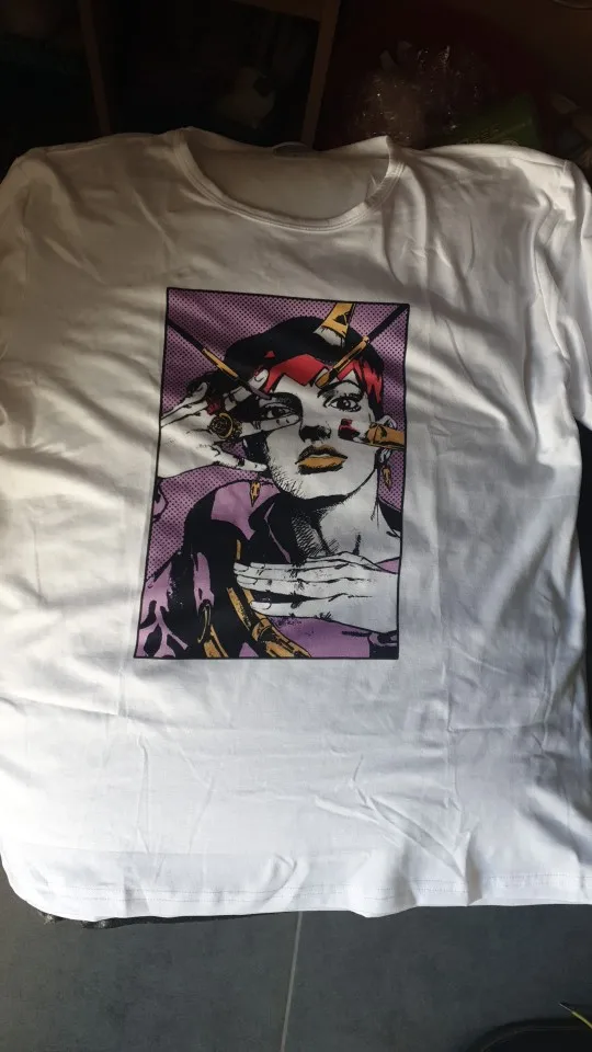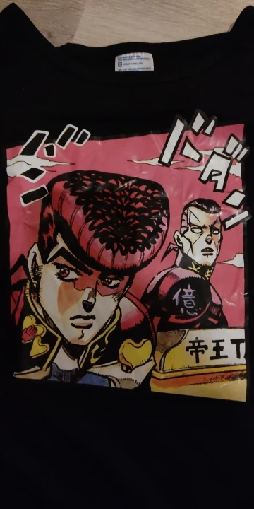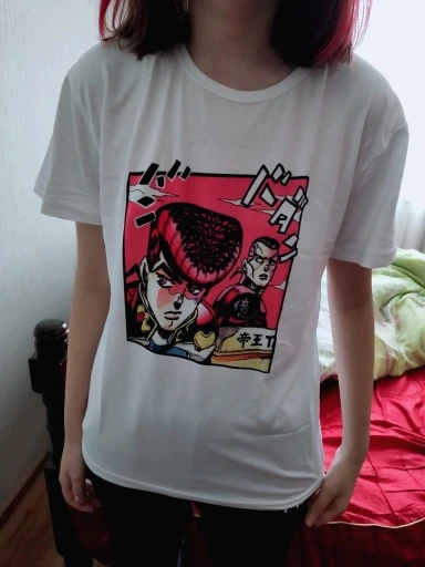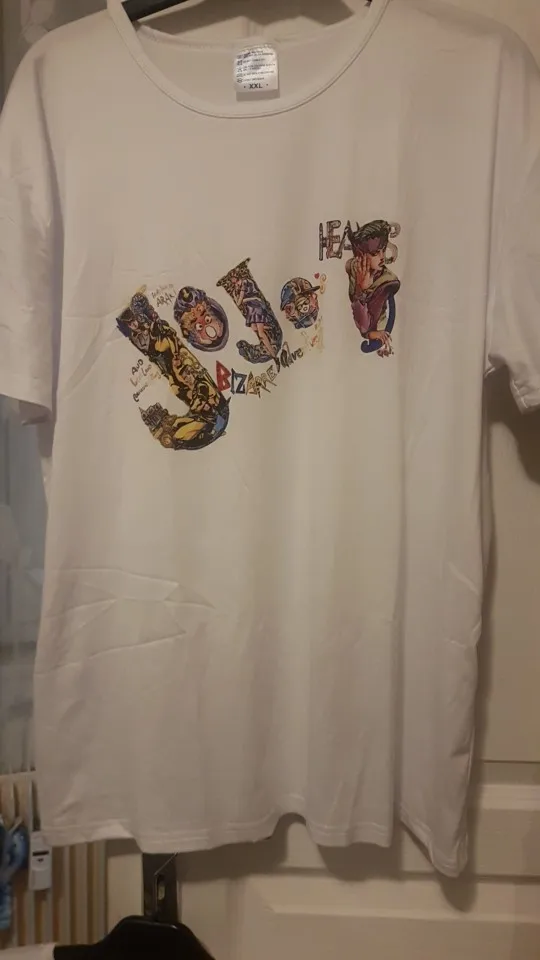 Ткань в порядке, но это то, что я ожидал, мне очень нравится, потому что я Джоджо фанат :) проблема в том, что я не думаю, что вы можете положить его в стиральную машину, не испортив рисунок (Вы должны были бы вымыть вручную или просто вымыть его водой). Я измеряю 1'66, и я думаю, что я попросил размер XXL, который, я думаю, является самым большим (потому что мне нравятся большие рубашки) И это подходит мне немного шире, так что если есть кто-то Высокий/а, кто хочет купить его, я рекомендую купить XXL или самый большой размер, который есть xdd Но по цене это нормально