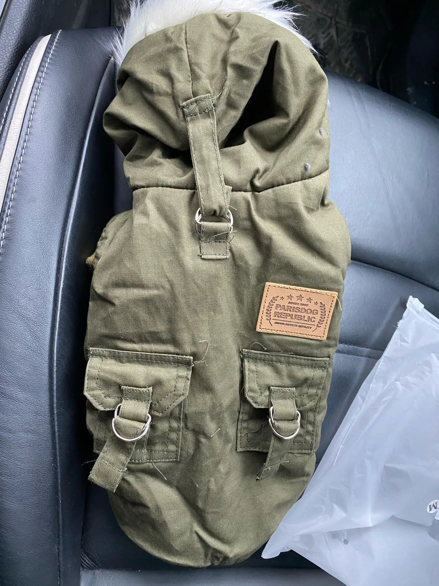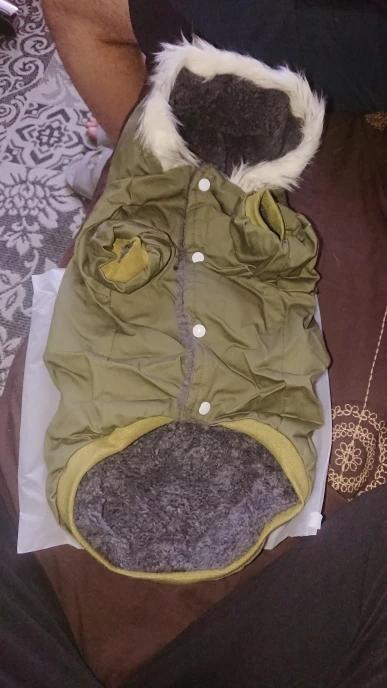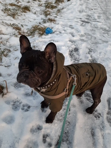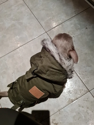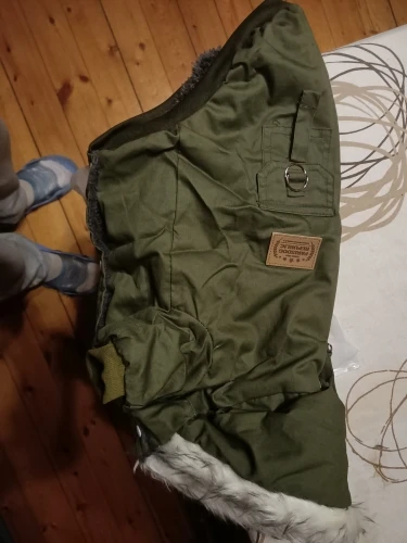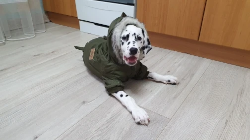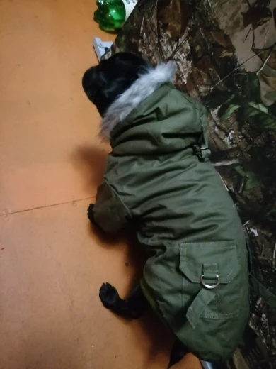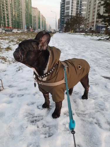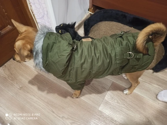 Доставка довольно быстрая, прям к снегу поступила. Но к сожалению куртка псу прям впритык, в груди, но это особенности породы (мой бульдог весит 13,5 кг)буду придумывать другие застежки, чтоб увеличить объем в груди. Ну и по спине длинновата, что тоже решаемо. А так очень теплая, швы качественные, дизайн классный, получаем много комплиментов.