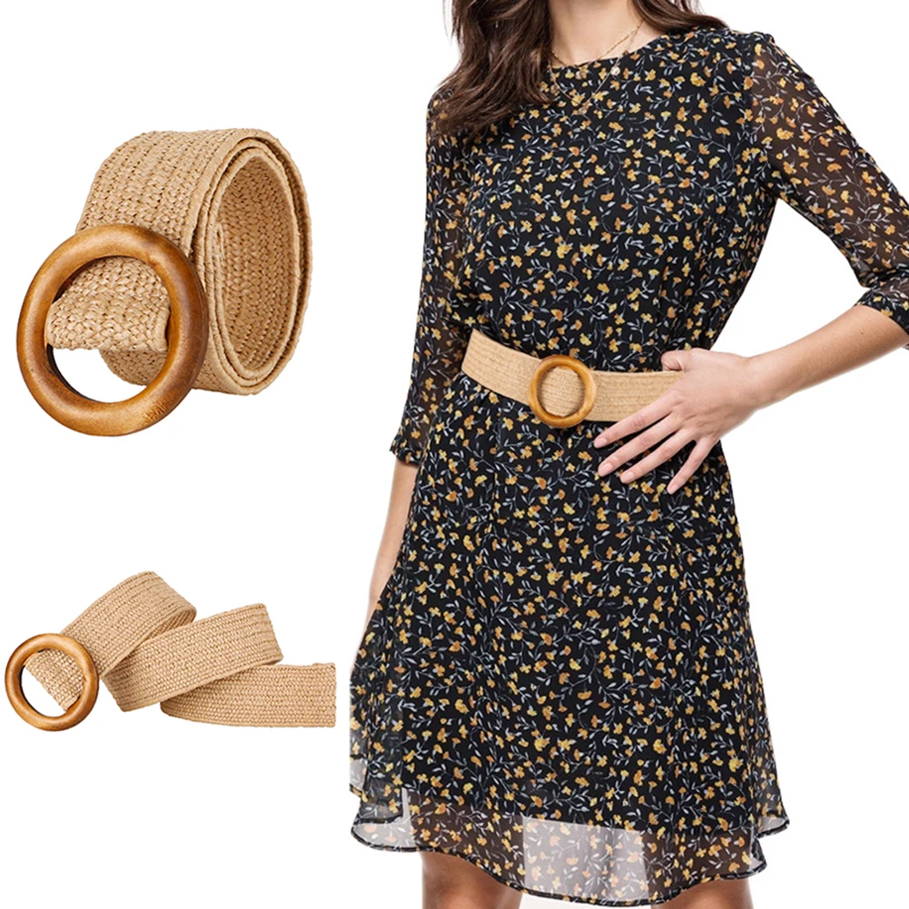 Ремень женский Плетеный с круглой пряжкой, модный тканый широкий Повседневный Пояс из полипропилена, соломенный пояс с деревянной пряжкой, 2020