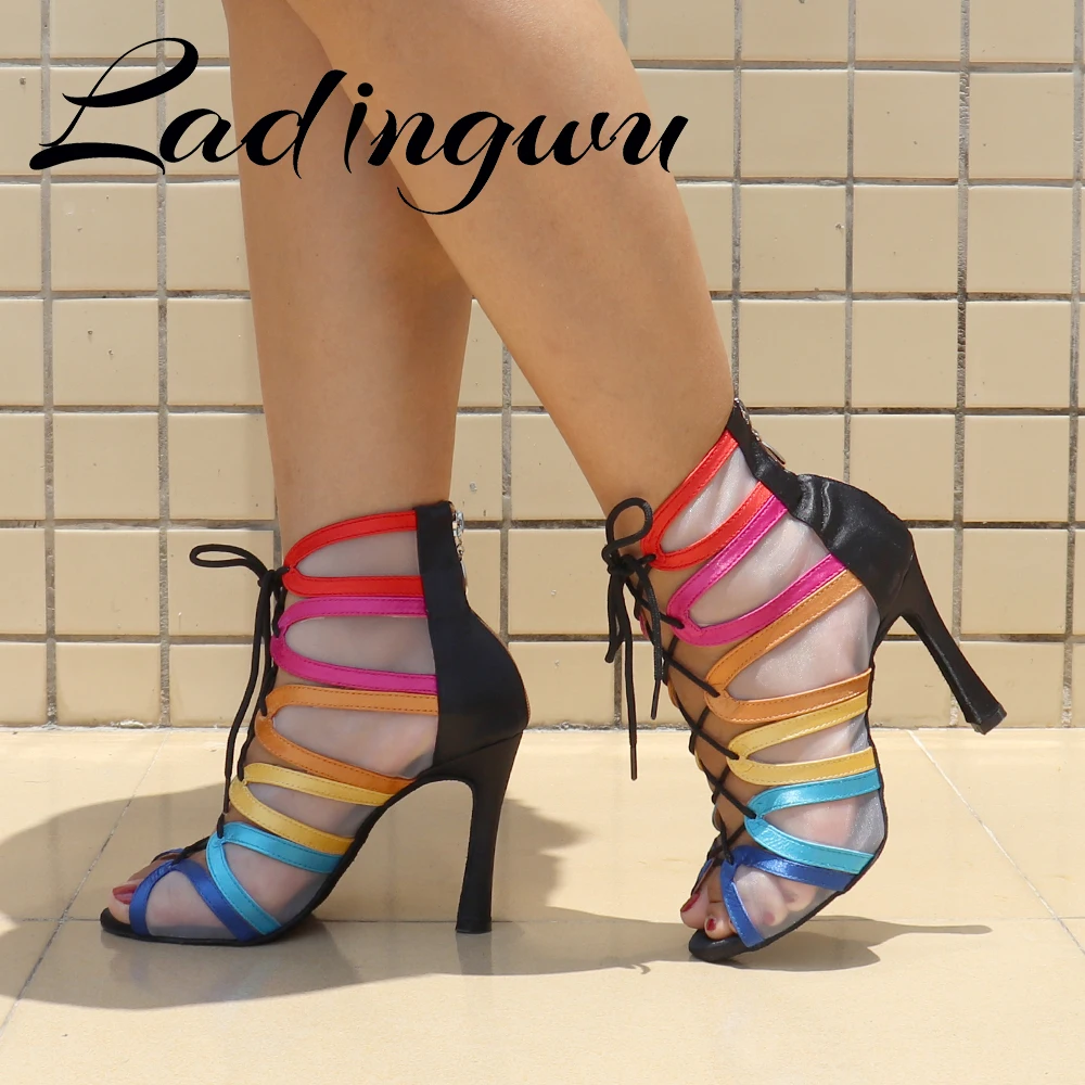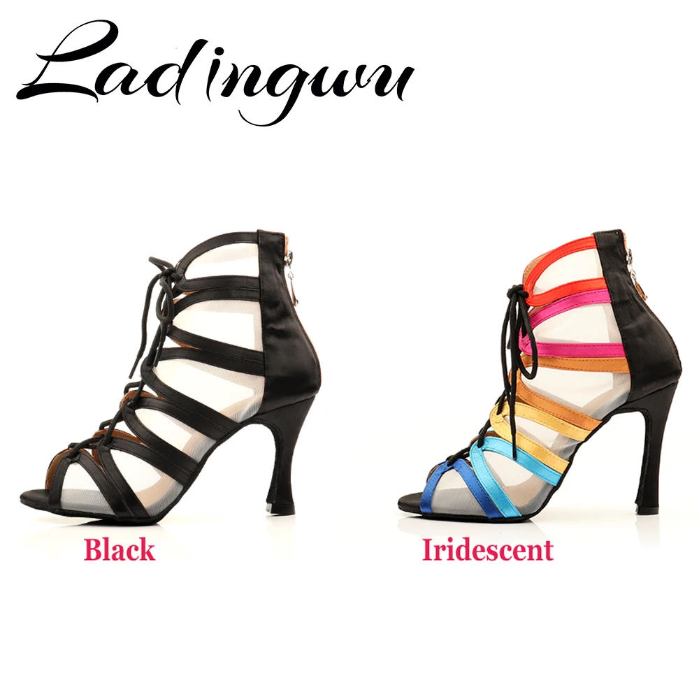 LadingwuЖенская обувь для латинских бальных танцев; Цвет черный, многоцветный; Сатиновые и сетчатые латинские танцевальные туфли для детей; Танцевальная обувь для сальсы