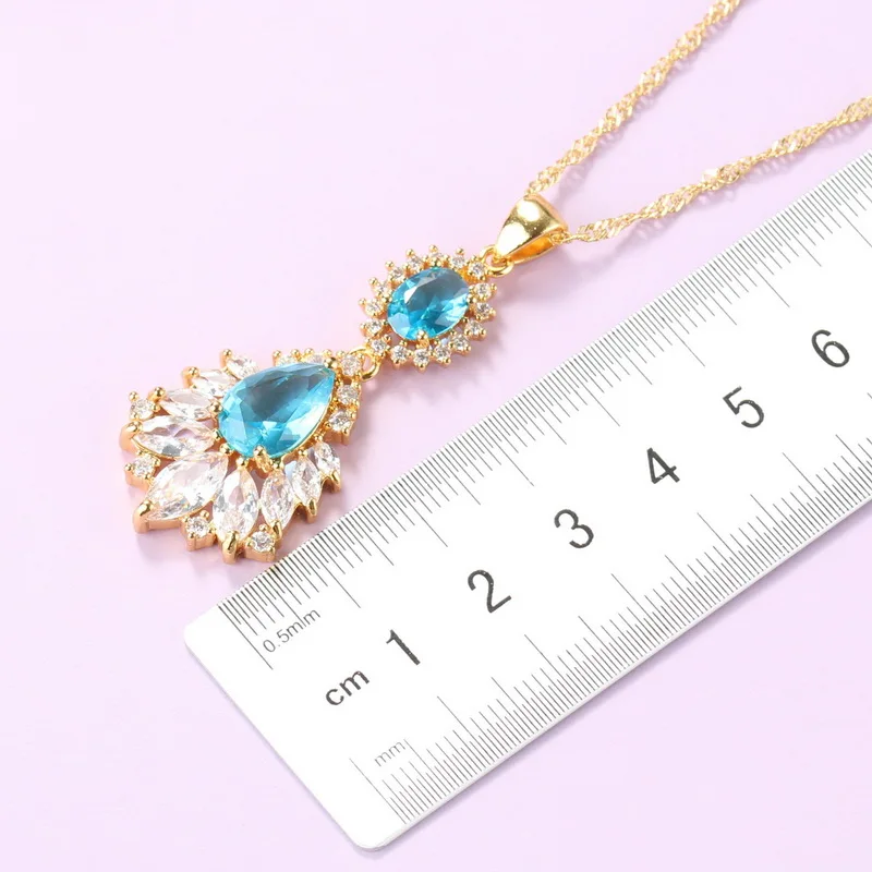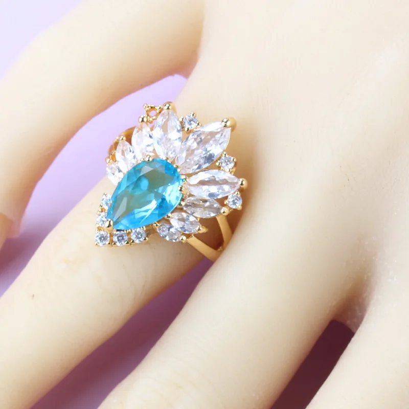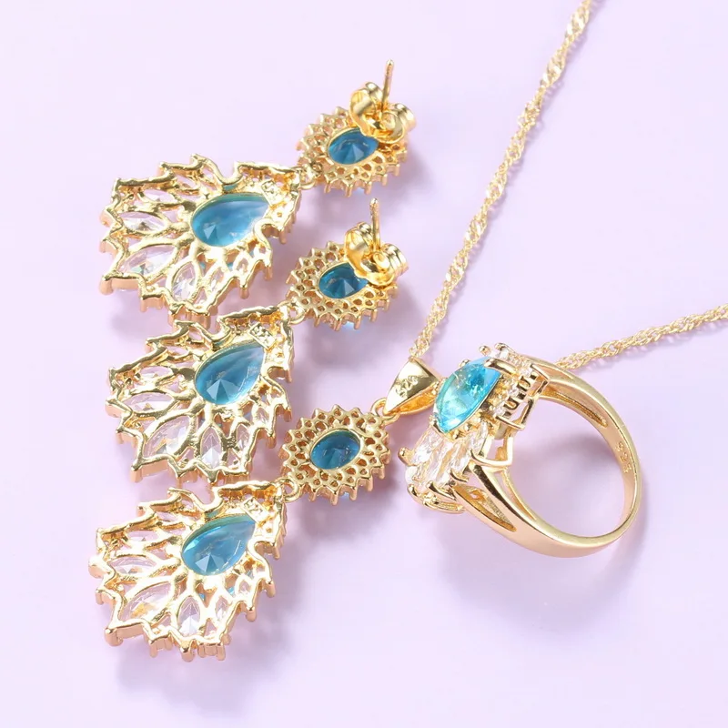 Наборы ювелирных изделий, ожерелье и кольцо, золотистого цвета, с фианитами небесно-голубого цвета