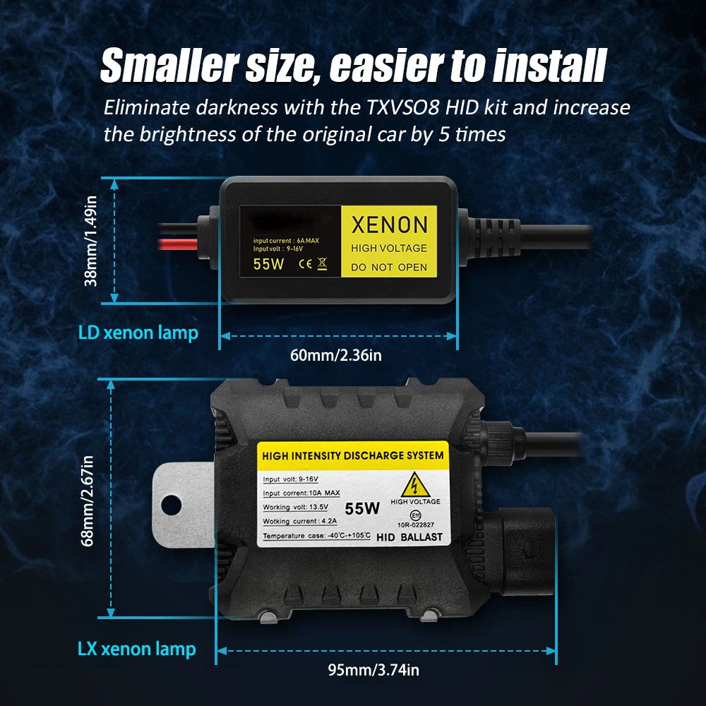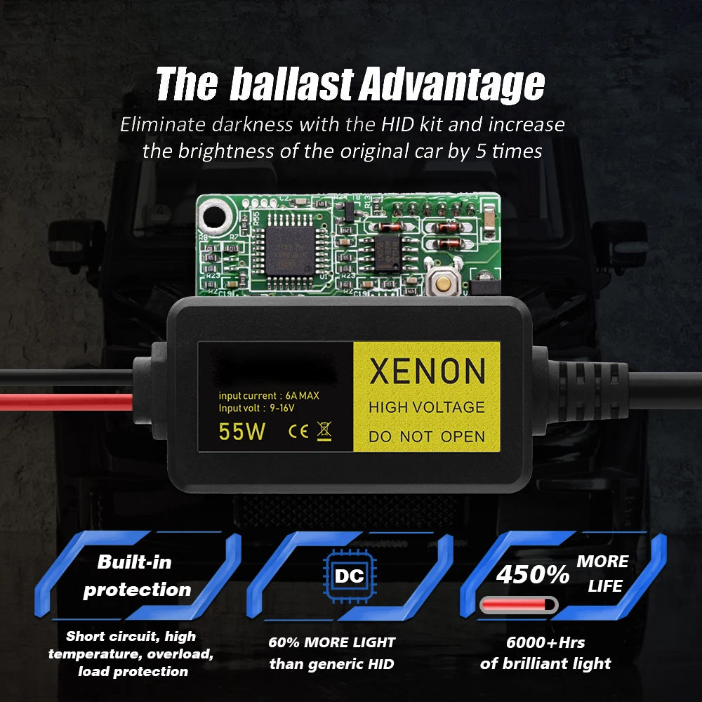 1,6 часов непрерывной работы тест на старение.2. Тест на защиту цепи подключения.3. Тест на защиту от короткого замыкания.4. Отсутствие проверки защиты от напряжения.5. Тест на защиту от перенапряжения.6. Тест на сотряжение вспышки.7. Проверка Quakeproof.8. Тест на холодную и теплую обувь.9. Испытание на защиту от полярности.10.EMC тест против помех.Технические характеристикиВходное напряжение: 9-16 ВНапряжение: 13,2 ВВ настоящее время норма: 4.2AМаксимальный ток: 6АКомплектация:1 комплект HID включает в себя: 2 ксеноновые лампы и 2 тонкие балласты
