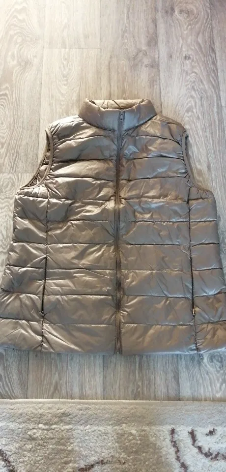 Цвет по факту оказался оливковым. Нужно брать на 1 размер больше, чем Вы носите, я заказала на 2 размера больше, по таблице, безрукавка большая.