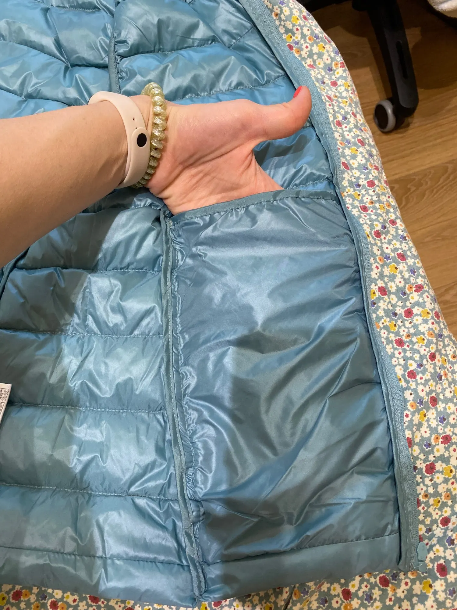 Цвет совпал, очень красивый. Очень-очень Токая вещь, очень нежный материал, при активной носке поползёт скорее всего. Внутри нежнячий пух. Потайные карманы. Вначале один не могла расстегнуть, потом получилось. Слегка заедал, сделана молния там в миллиметре прямо. Ещё внутри есть карманы с обеих сторон. По виду эта вещь требует очень аккуратного и бережного ухода и носки…. По размеру получилось впритык на голое тело в груди, где ОГ-92, брала L. Придётся с чем-то тонким )(