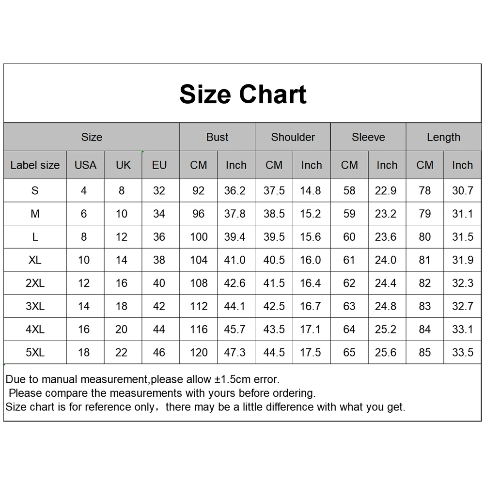Женская Повседневная Свободная рубашка в горошек с длинным рукавом и отложным воротником Характеристики: Изготовлен из высококачественного материала, приятного для кожи и мягкого. Однотонный цвет, легко сочетается с джинсами, шортами, повседневными брюками и т. д. Подходит для работы, школы, путешествий, покупок, повседневной носки и т. д. Свободная рубашка, не обнимает плотно тело, Носите комфортно. Тип: рубашка Тип размера: Обычный Пол: женщины Материал: нейлон, полиэстер, спандекс Стиль: Повседневный Длина рукава: длинный рукав Тип воротника: отложной воротник Уход За Одеждой: ручная стирка Особенности: рубашка на пуговицах, принт в горошек, свободный крой Сведения о размере [Наш Размер S] Обхват груди: 92 см/36,2 дюйма, Плечи: 37,5 см/14,8 дюйма, рукав: 58 см/22,8 дюйма, длина: 78 см/30,7 дюйма (прибл.) [Наш Размер M] Обхват груди: 96 см/37,8 дюйма, Плечи: 38,5 см/15,2 дюйма, рукав: 59 см/23,2 дюйма, длина: 79 см/31,1 дюйма (прибл.) [Наш Размер L] Обхват груди: 100 см/39,4 дюйма, Плечи: 39,5 см/15,6 дюйма, рукав: 60 см/23,6 дюйма, длина: 80 см/31,5 дюйма (прибл.) [Наш Размер XL] Обхват груди: 104 см/40,9 дюйма, Плечи: 40,5 см/15,9 дюйма, рукав: 61 см/24 дюйма, длина: 81 см/31,9 дюйма (прибл.) [Наш Размер 2XL] Обхват груди: 108 см/42,5 дюйма, Плечи: 41,5 см/16,3 дюйма, рукав: 62 см/24,4 дюйма, длина: 82 см/32,3 дюйма (прибл.) [Наш Размер 3XL] Обхват груди: 112 см/44,1 дюйма, Плечи: 42,5 см/16,7 дюйма, рукав: 63 см/24,8 дюйма, длина: 83 см/32,7 дюйма (прибл.) [Наш Размер 4XL] Обхват груди: 116 см/45,7 дюйма, Плечи: 43,5 см/17,1 дюйма, рукав: 64 см/25,2 дюйма, длина: 84 см/33,1 дюйма (прибл.) [Наш Размер 5XL] Обхват груди: 120 см/47,2 дюйма, Плечи: 44,5 см/17,5 дюйма, рукав: 65 см/25,6 дюйма, длина: 85 см/33,5 дюйма (прибл.) Примечания: Пожалуйста, обратитесь к нашей таблице размеров и выберите правильный размер. Из светильник и настройках экрана цвет товара может сильно отличаться от изображений Посылка входит: 1 х рубашка (другие не включены)