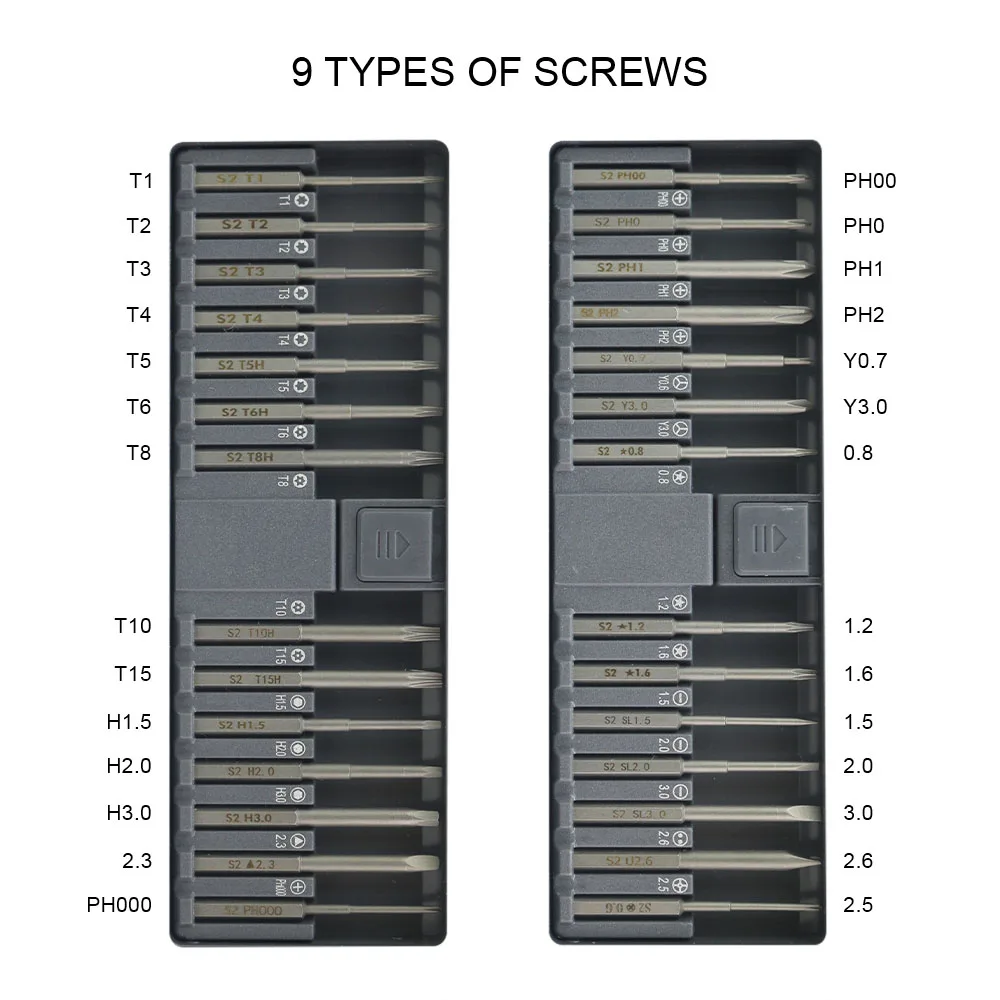 Биты:• Torx:T1, T2, T3, T4, T5H, T6H, T8H, T10H, T15H для телефона Android• Шестигранник: H1.5, H2.0, H3.0• Треугольник: 2,3 для бытовой техники• Phillips: PH000 PH00,PH0,PH1,PH2 для бытовой техники• Тип Y: Y0.7, Y3.0 для GB BBA NSDL WII• Звезда: 0,8, 1,2, 1,6 для телефона• Прорези: SL1.5, SL2.0, SL3.0 для бытовой техники• U "форма: 2,6 для Высокое качество патч Панель2,5