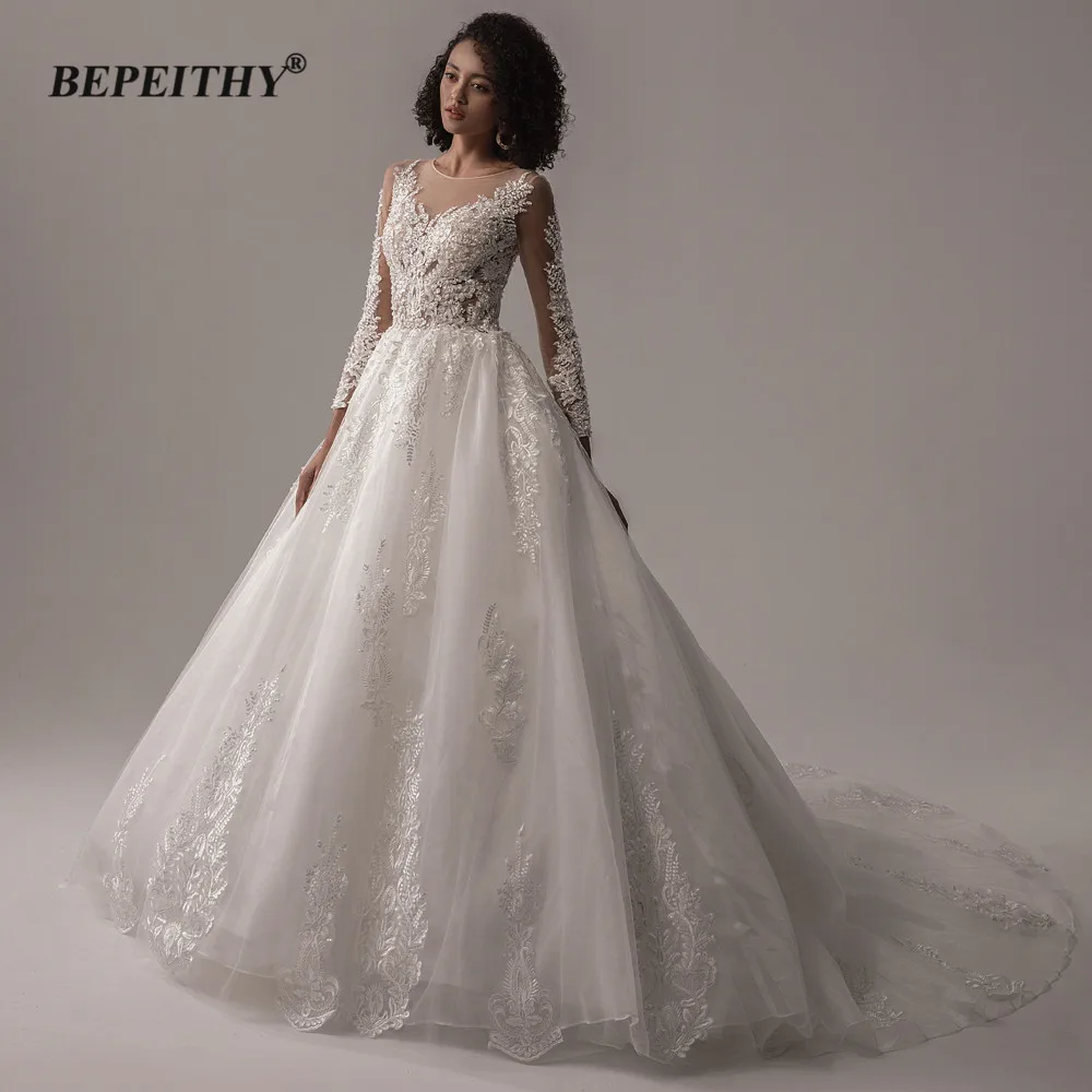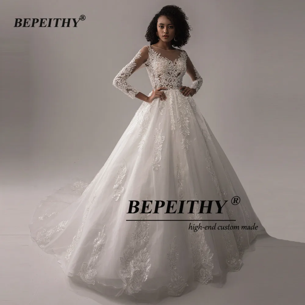BEPEITHY бальное платье кружевное свадебное платье для женщин 2021 принцесса с длинными рукавами свадебное платье с круглым вырезом винтажное свадебное платье новое